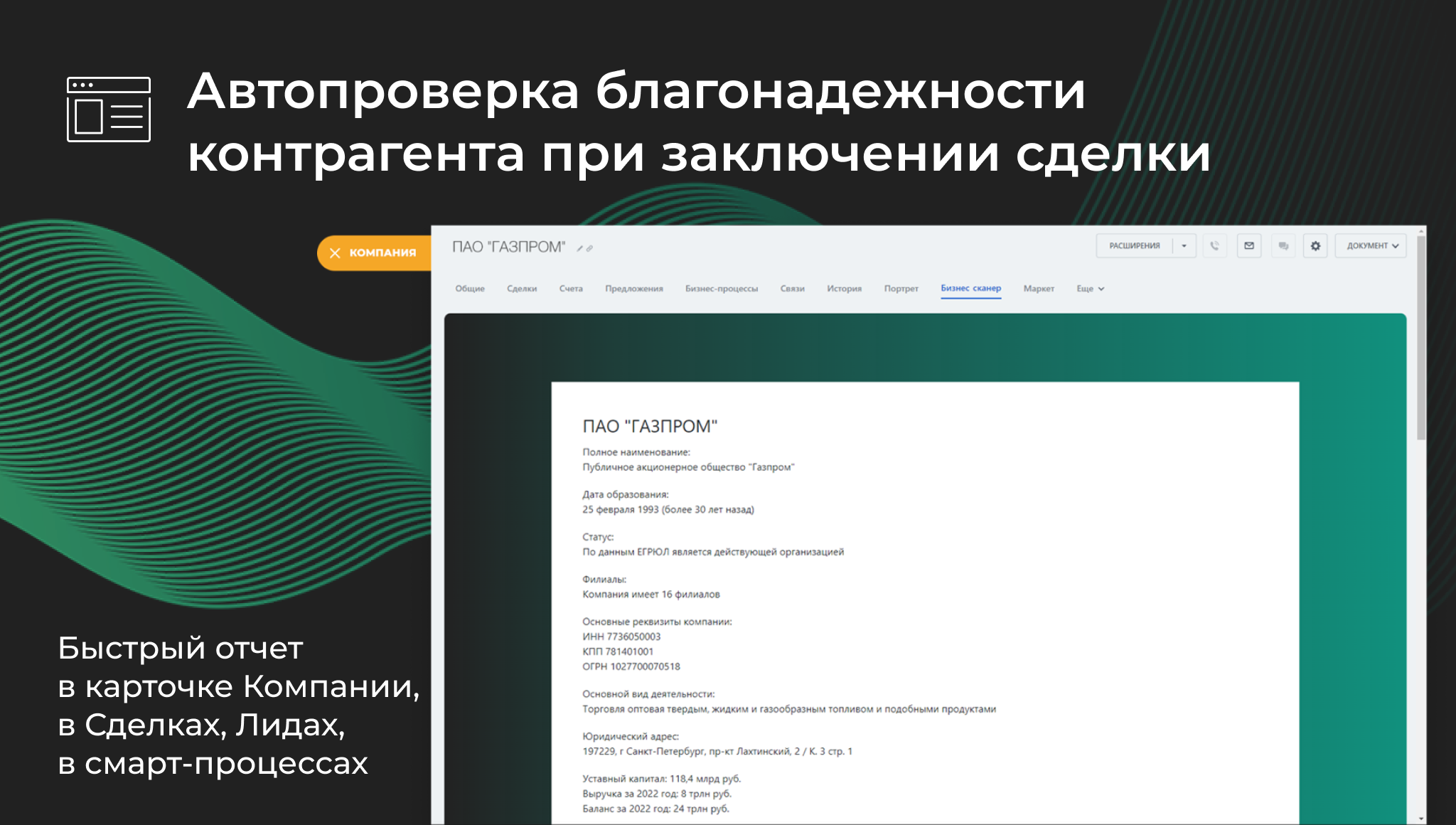 Просматривайте быстрый отчет в карточке компании / лида / сделки / смарт-процесса, выгружайте в поля Компании важную для вас информацию, скачивайте выписку из ЕГРЮЛ и быстрый отчет в pdf. И все это не выходя из Битрикс24.