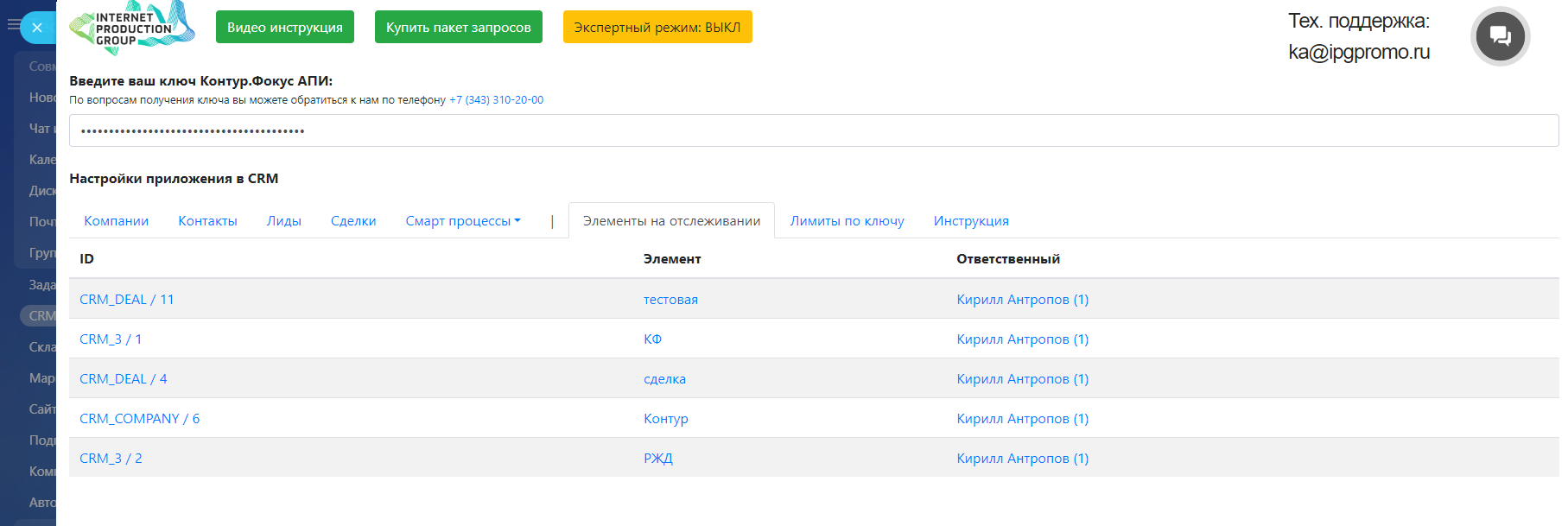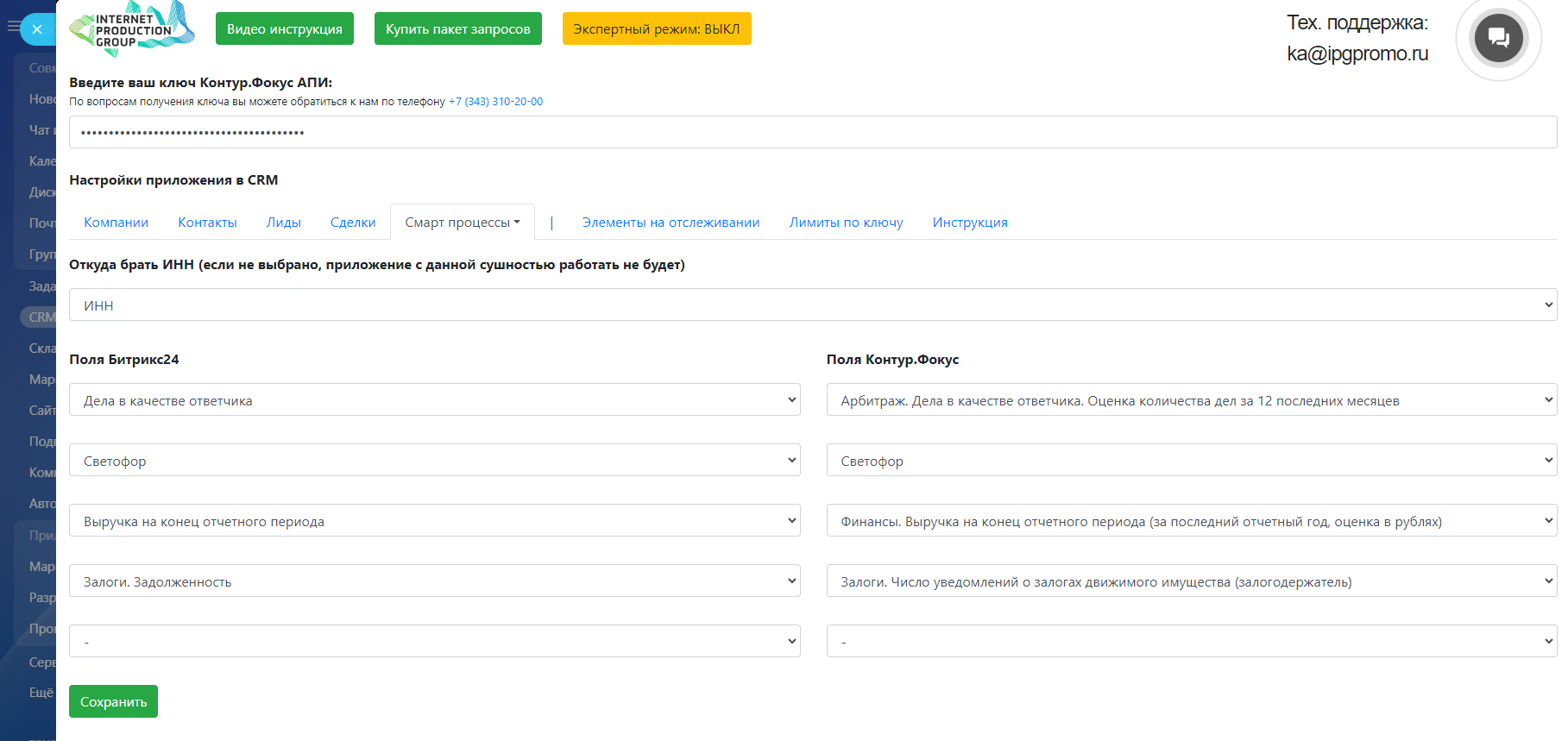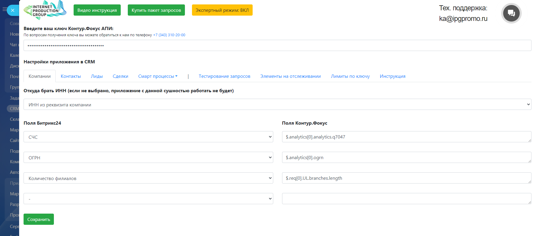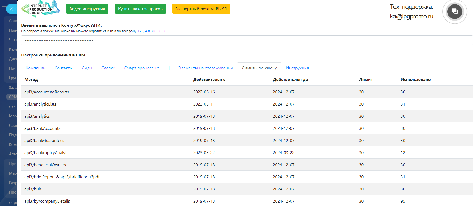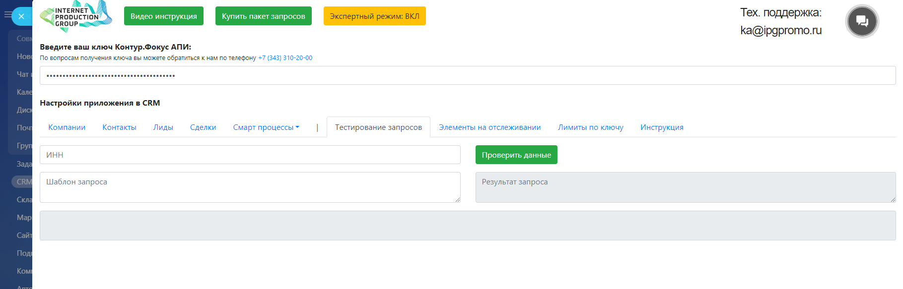 Также для работы приложения требуется ключ Контур Фокус API, его вы можете приобрести у нас на любое удобное вам количество запросов* по следующим ценам https://ipgpromo.ru/lp/kontur.focus/#b1846Также вы можете заказать у нас адаптацию приложения под ваши уникальные бизнес-процессы. Оценка предоставляется по запросу.
