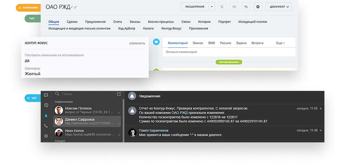 Просматривайте экспресс-отчет в карточке компании / лида / сделки, выгружайте в поля Компании важную для вас информацию, скачивайте финансовый отчет и выписку из ЕГРЮЛ. И все это не выходя из Битрикс24. - Наблюдение за рисками контрагента на всех этапах сделки.