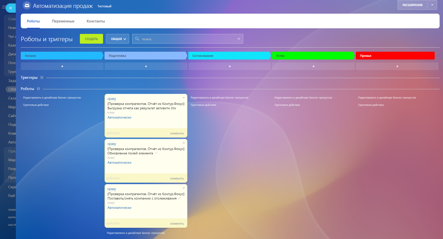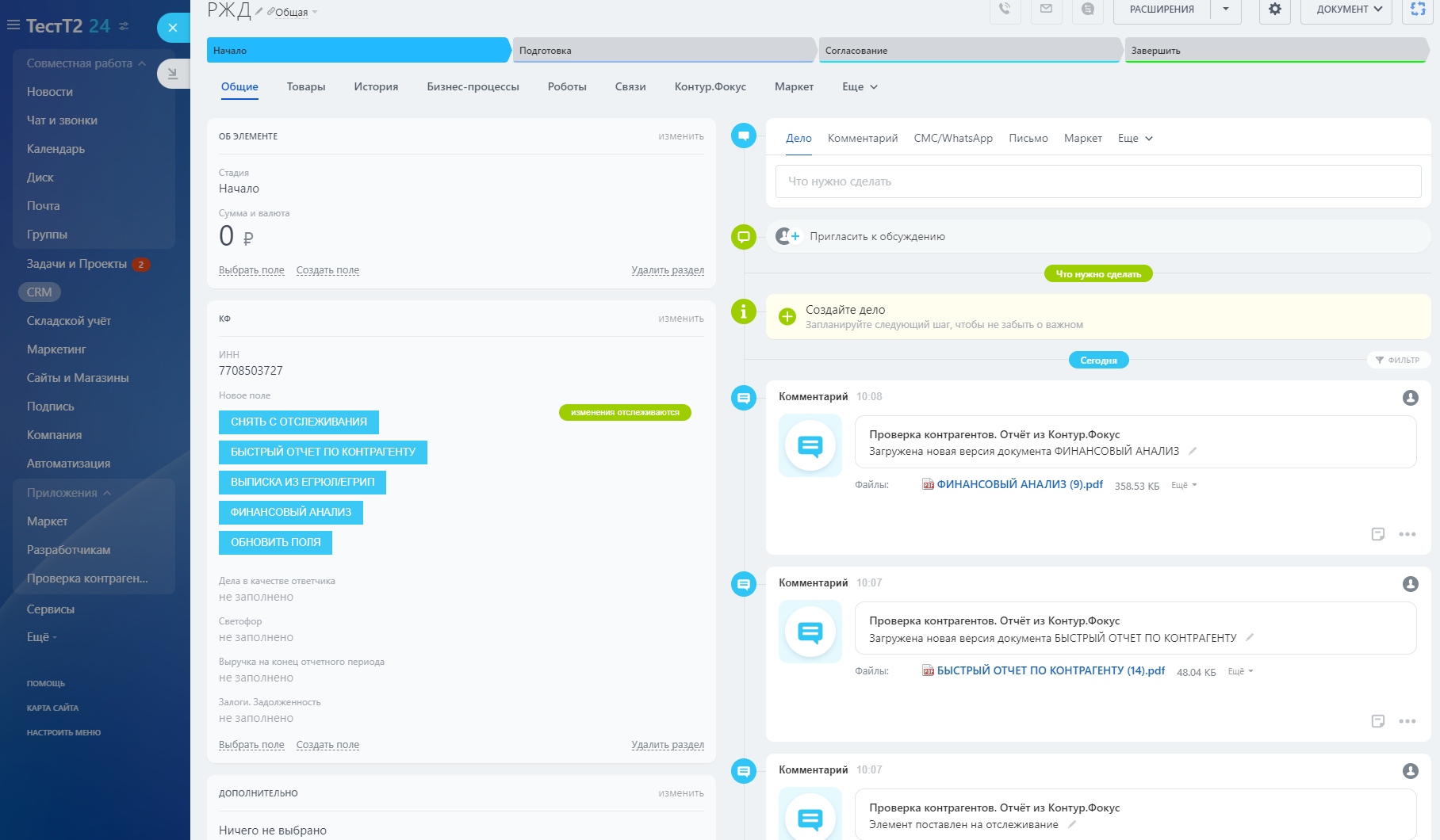 Приложение «Проверка контрагентов. Отчет из Контур Фокус ПРО» позволяет прямо в CRM Битрикс24 осуществлять проверку контрагентов в ручном и автоматическом режиме, а также мониторинг интересующих вас показателей, выгрузку и сохранение отчетов.