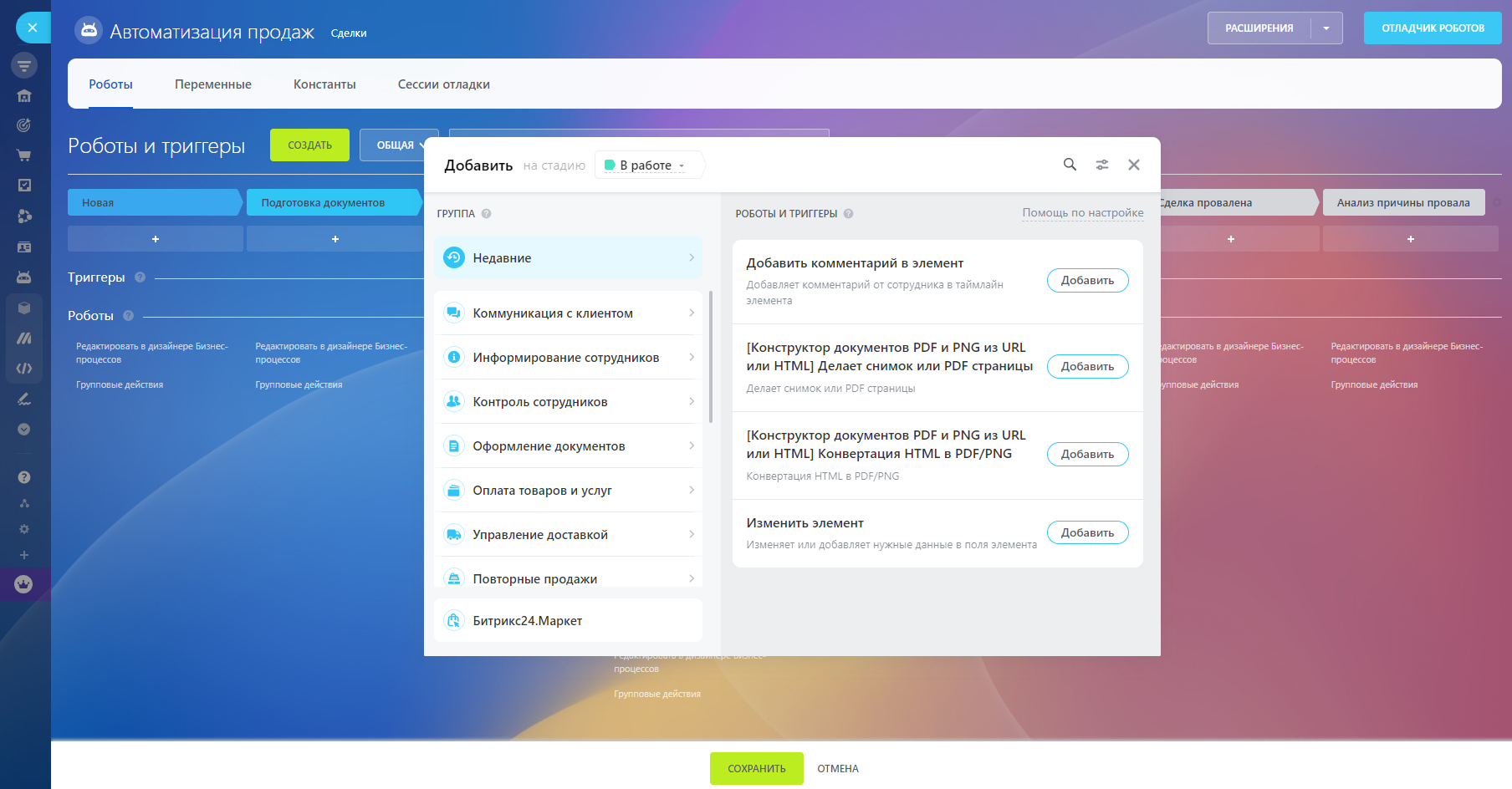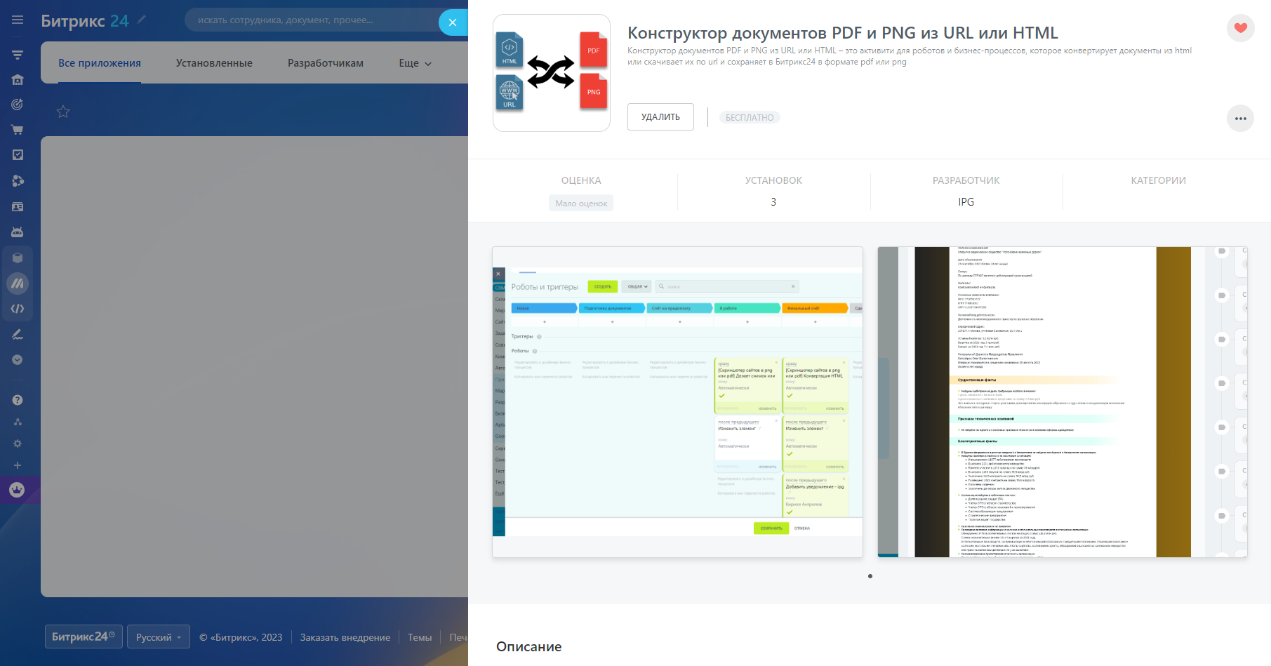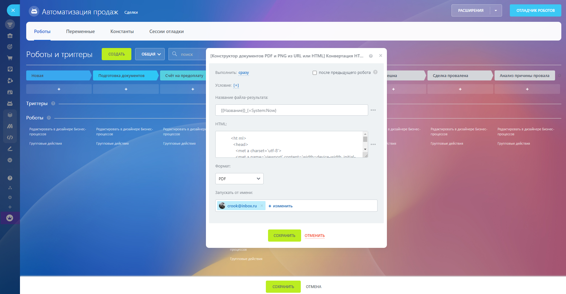 Конструктор документов PDF и PNG из URL или HTML – это активити для роботов и бизнес-процессов, которое конвертирует документы из html или скачивает их по url и сохраняет в Битрикс24 в формате pdf или png