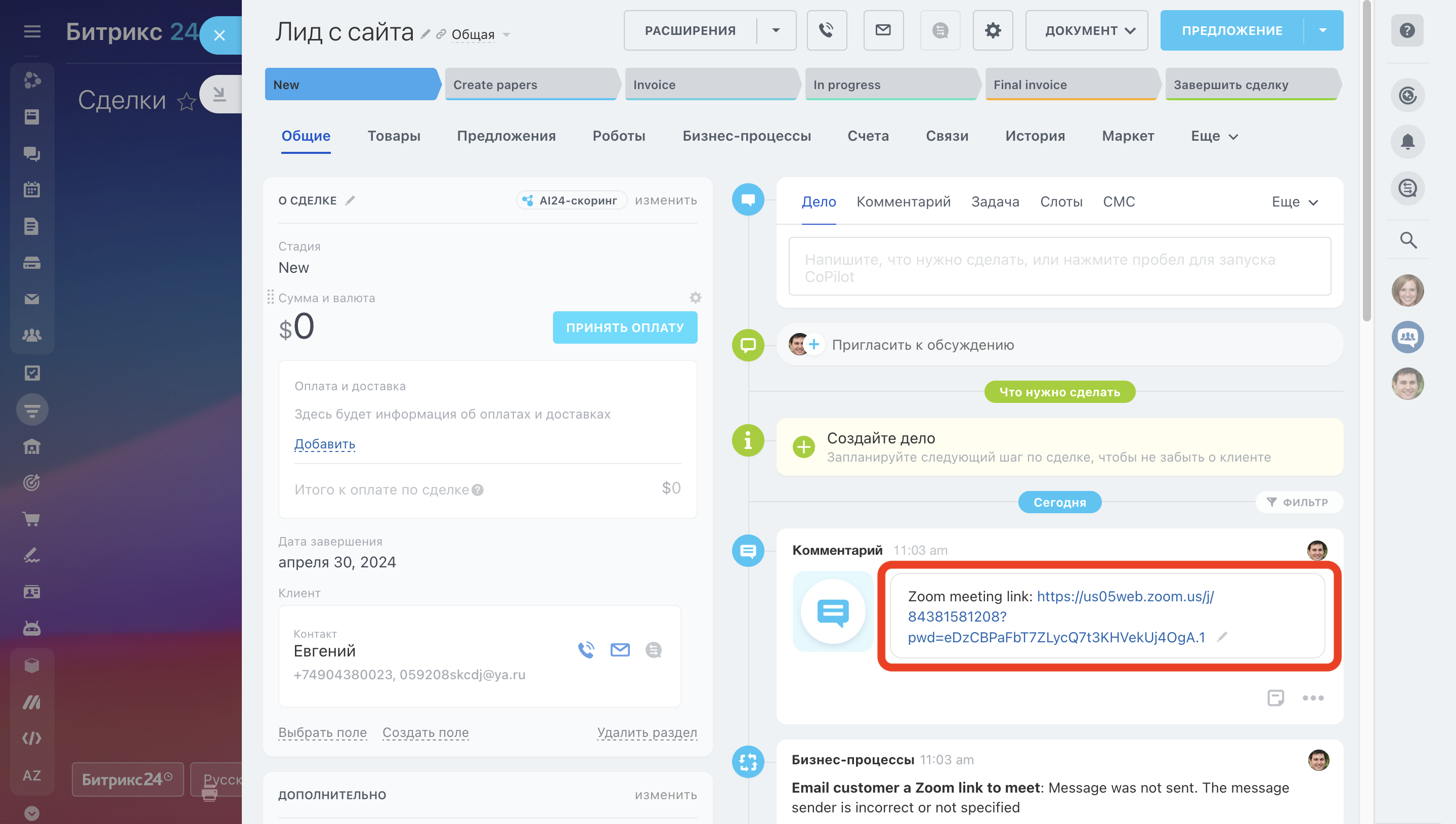 – Создай робота, который создает Zoom встречу на нужной тебе стадии Лида или Сделки.