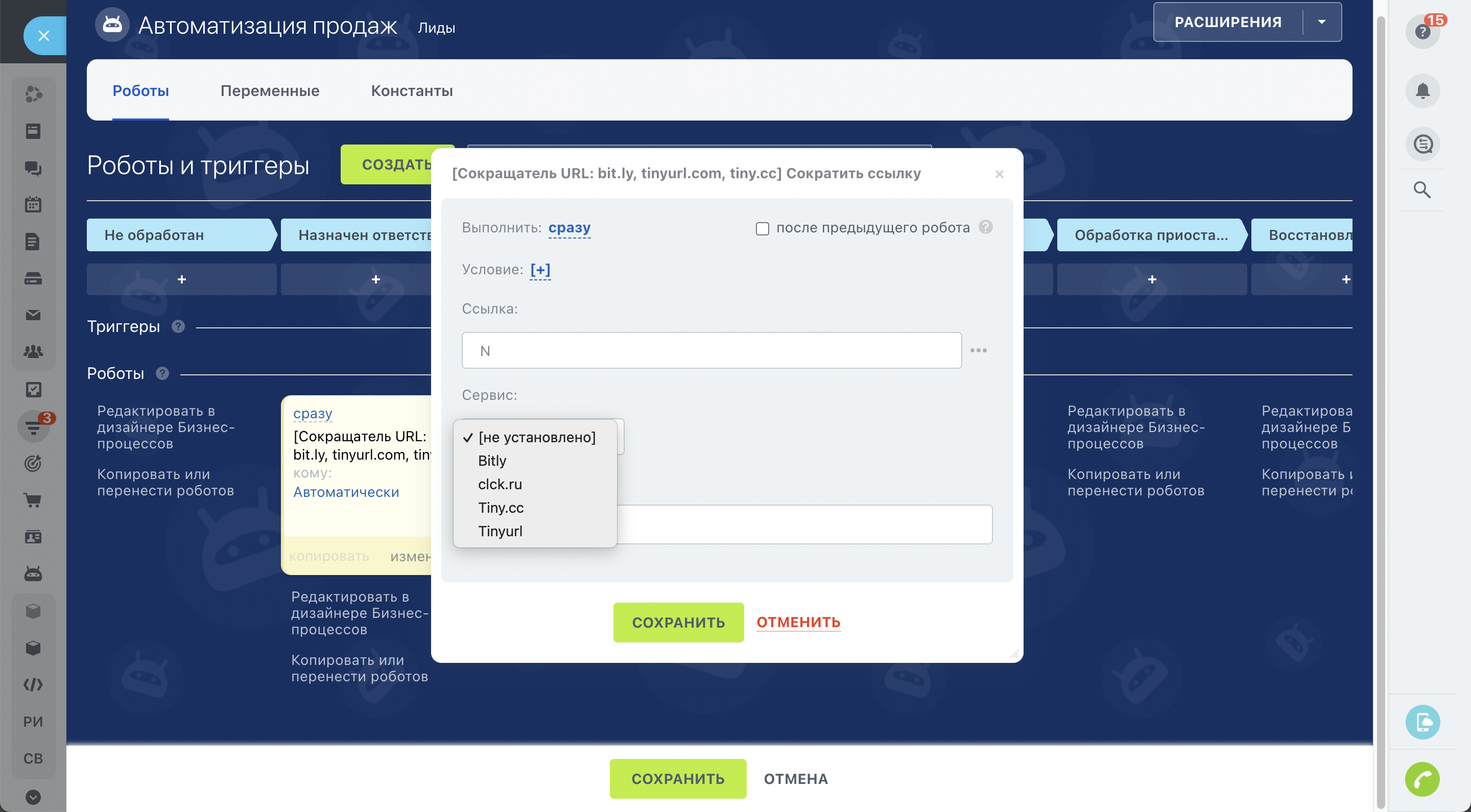 Это приложение дает возможность использовать в роботах и бизнес-процессах сокращатели ссылок bit.ly, tinyurl.com, tiny.cc, clck.ru.