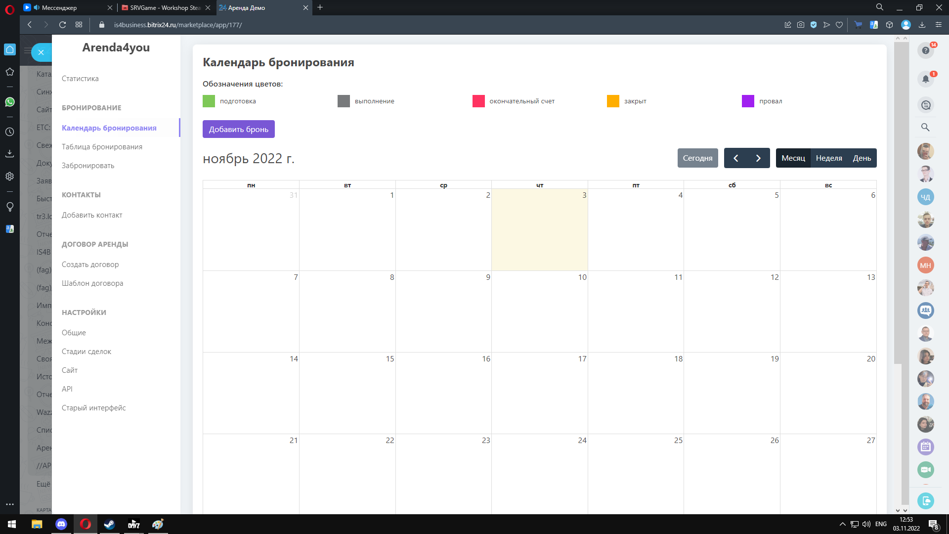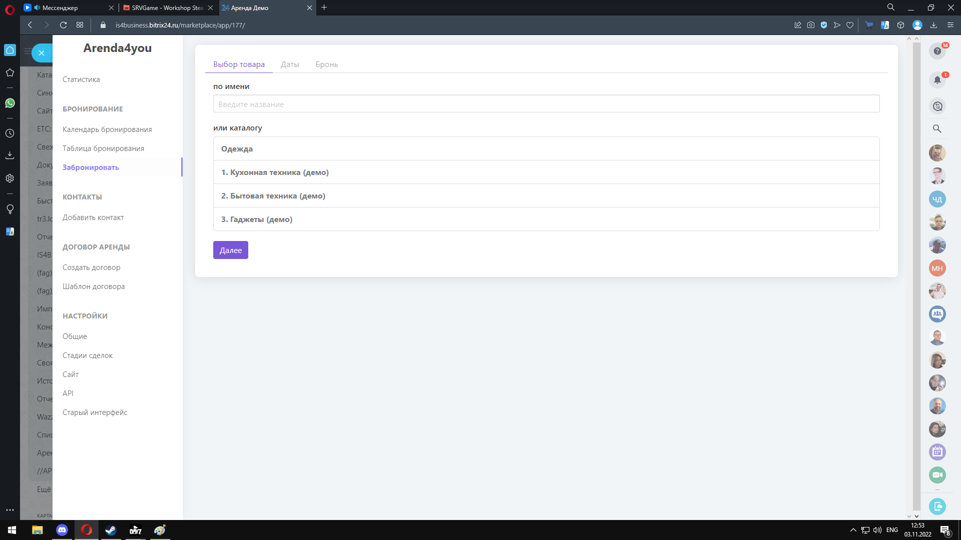 2. На вкладке «Бронь» укажите даты и выберите клиента из контактов