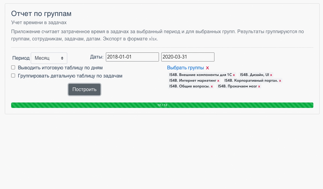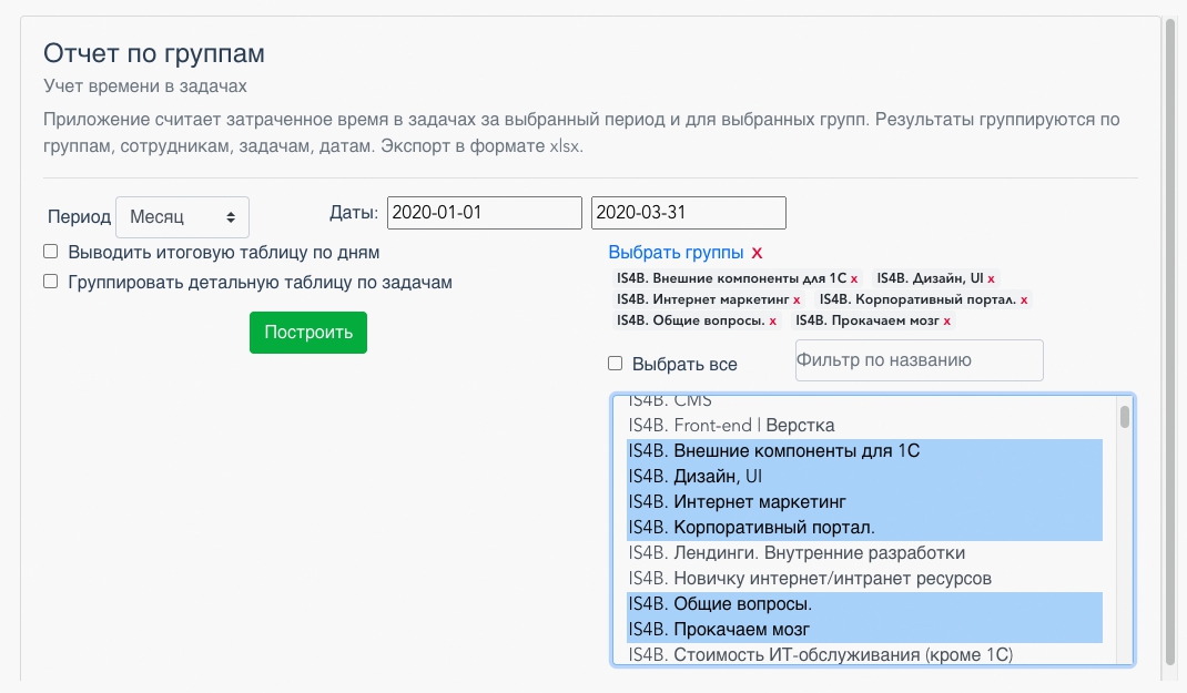 Данное приложение строит отчеты о затраченном времени в задачах, в разрезе групп/задач/сотрудников. Для построения отчета требуется указать промежуток дат, выбрать группы, задать дополнительные условия.