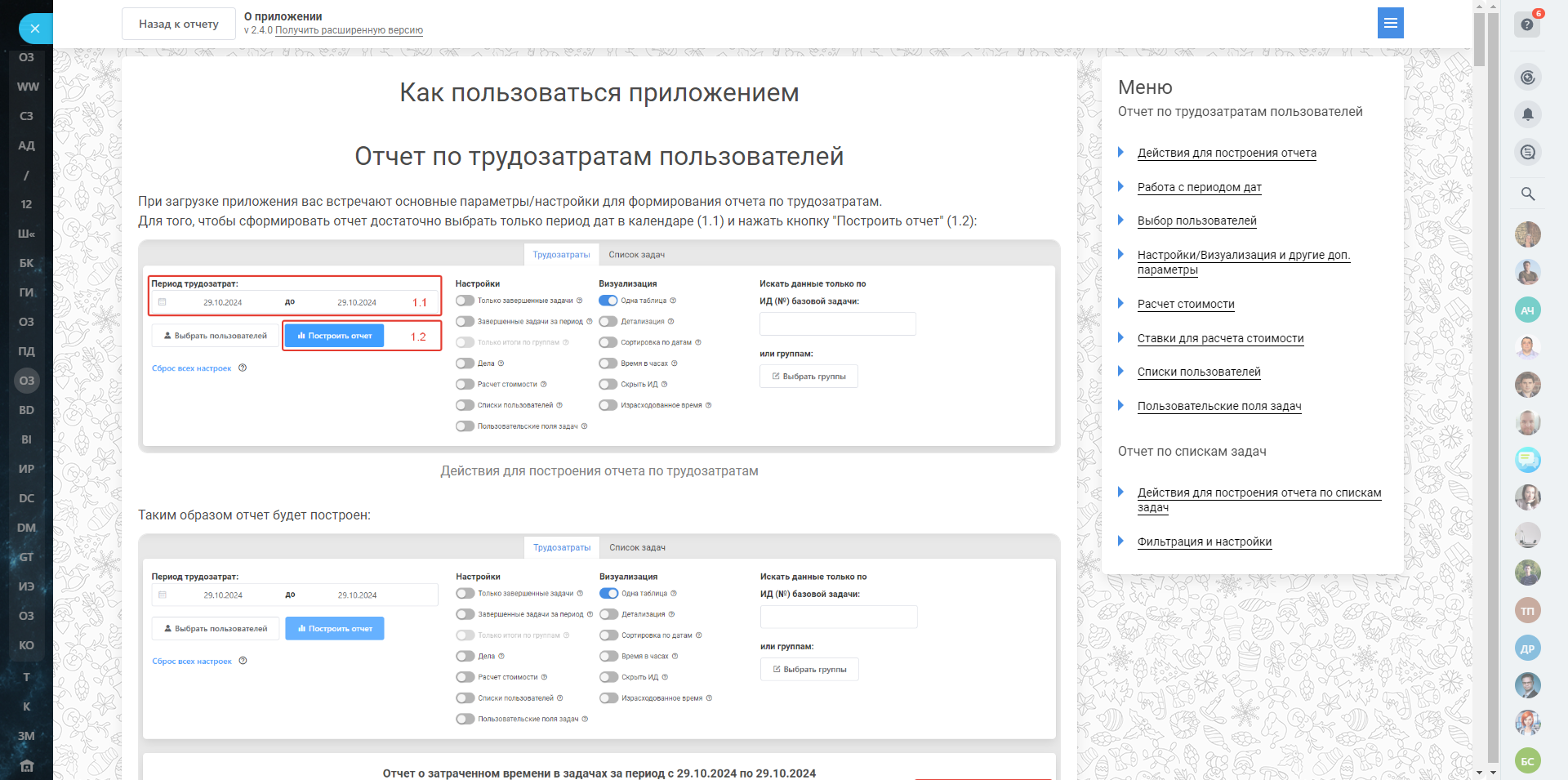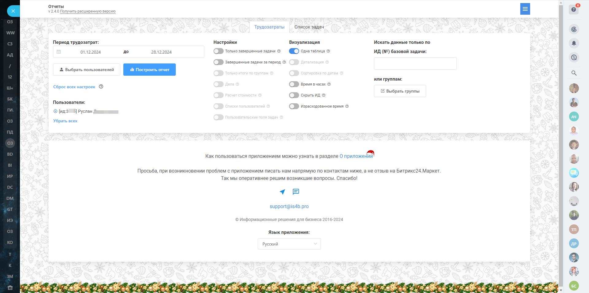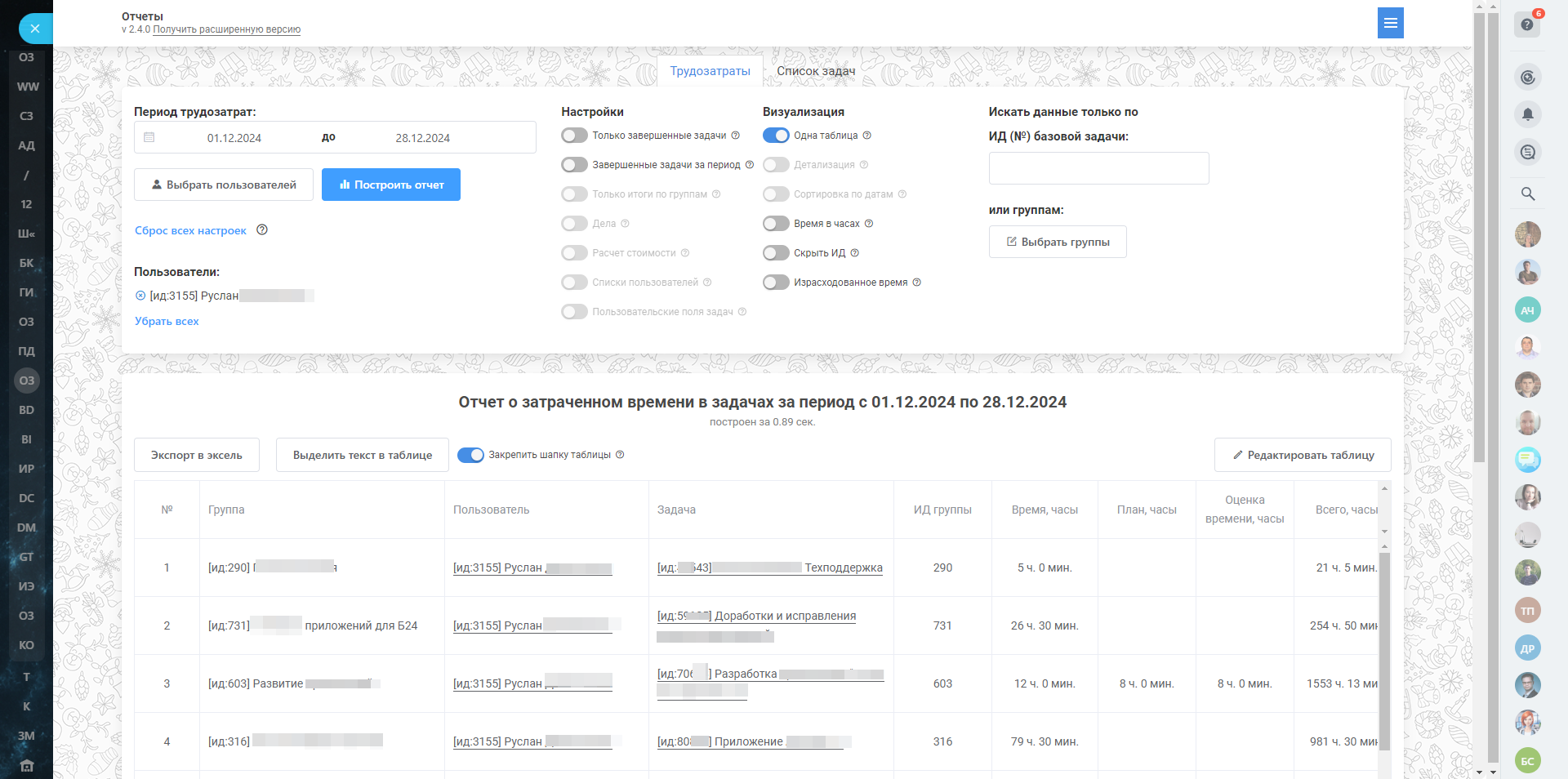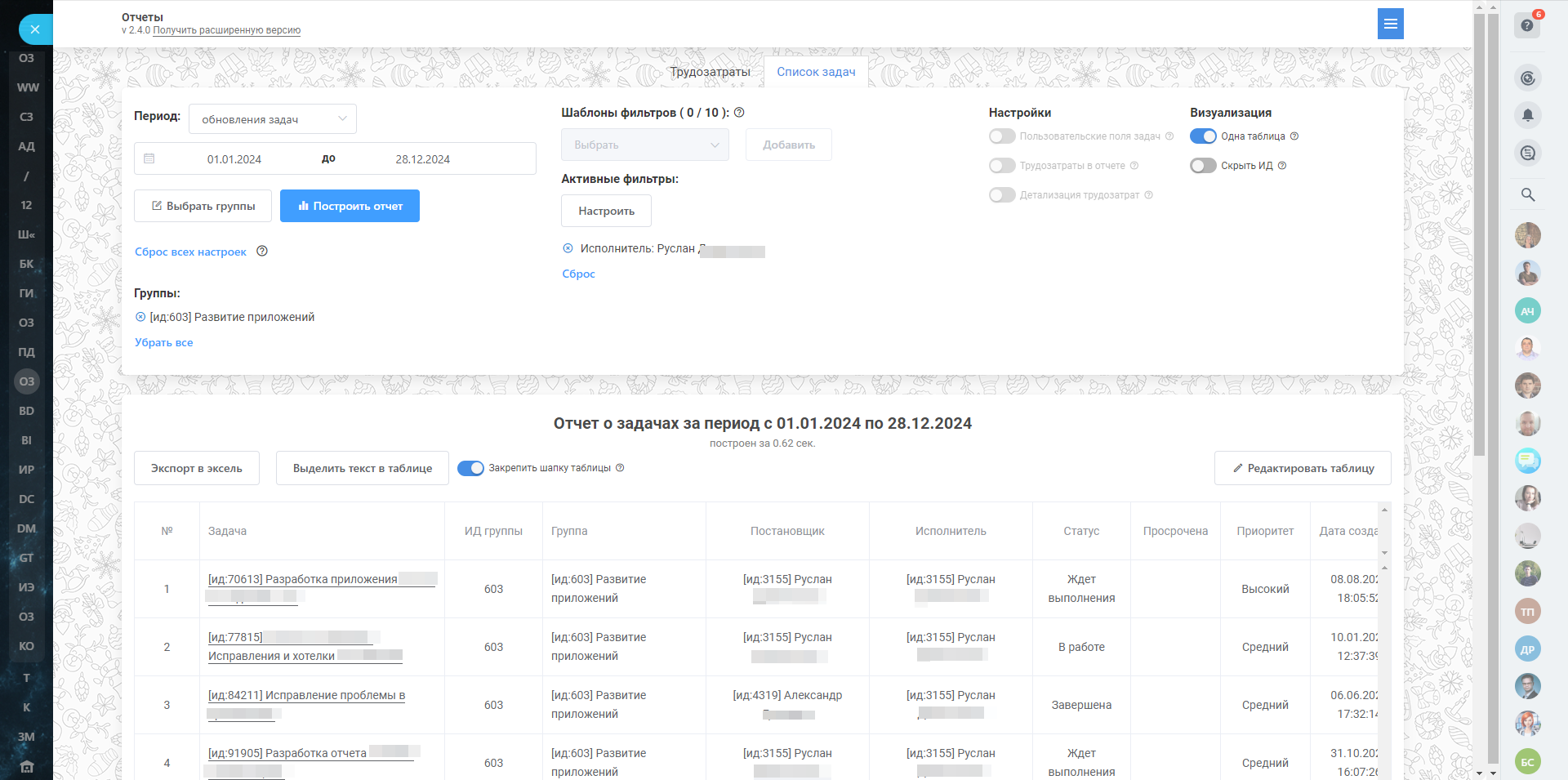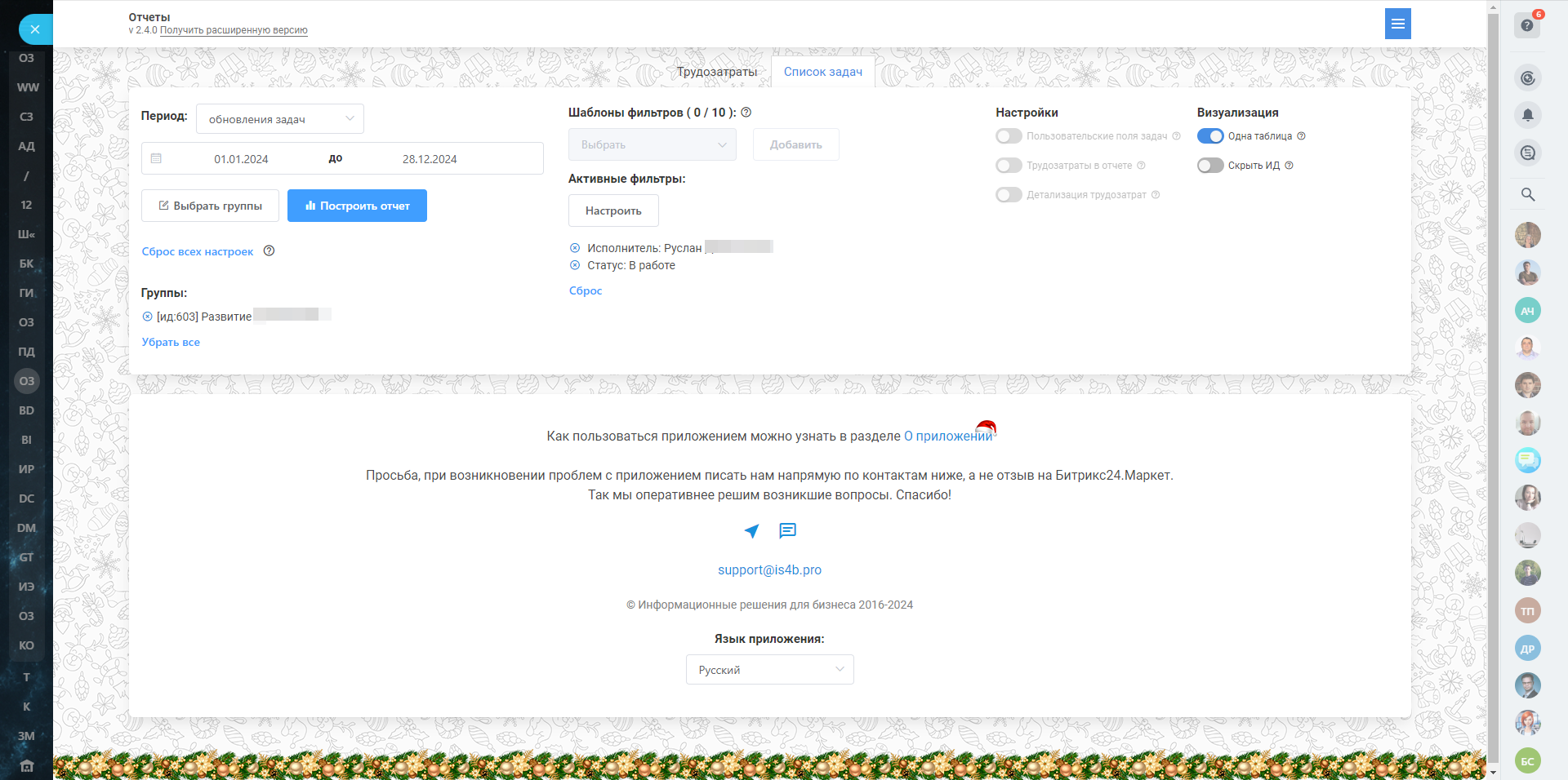 Приложение предназначено для формирования подробных отчетов по задачам и трудозатратам. Оно предоставляет широкие возможности для настройки результатов под индивидуальные потребности пользователя, включая кастомизацию таблиц и фильтрацию данных.