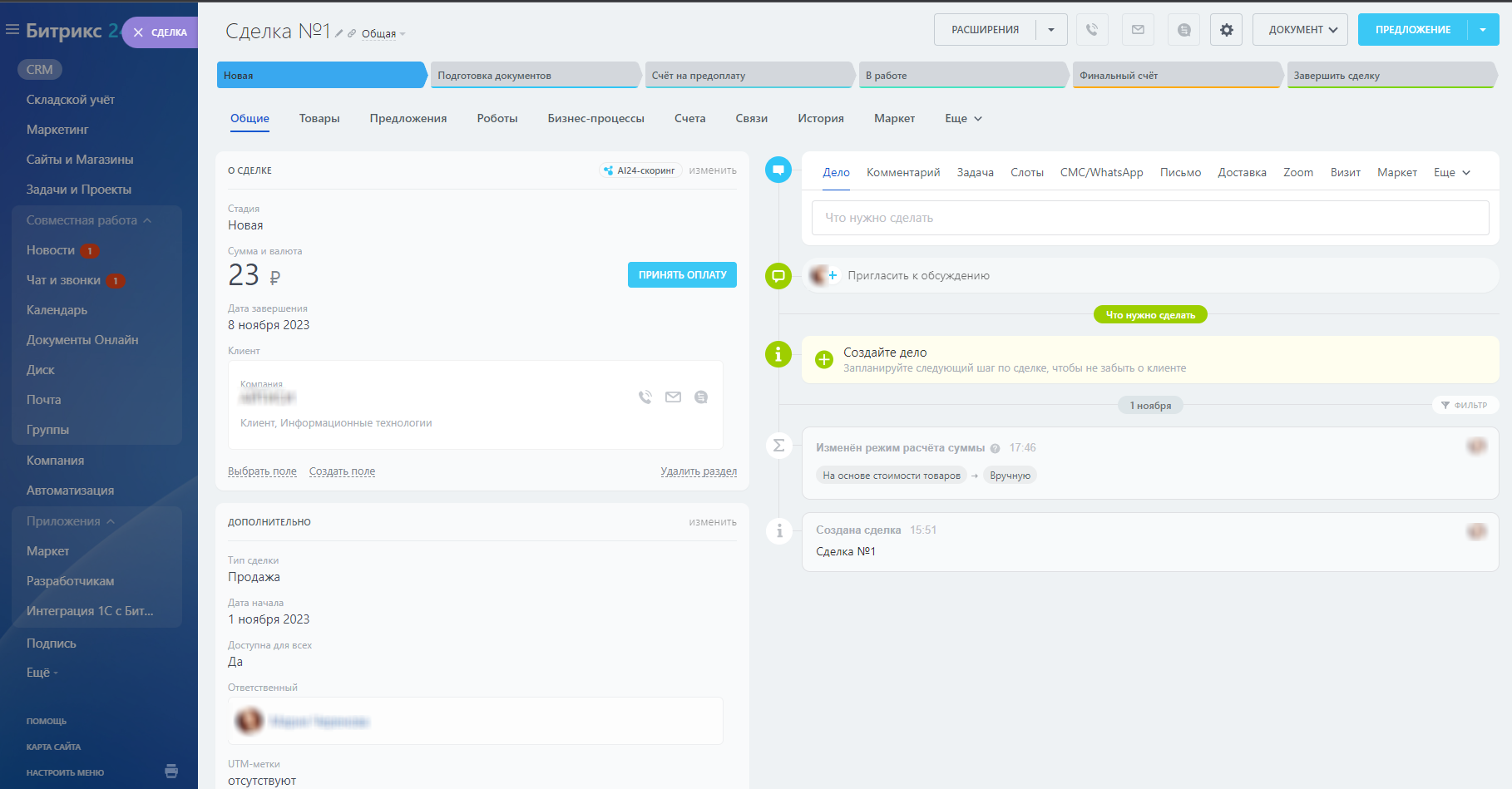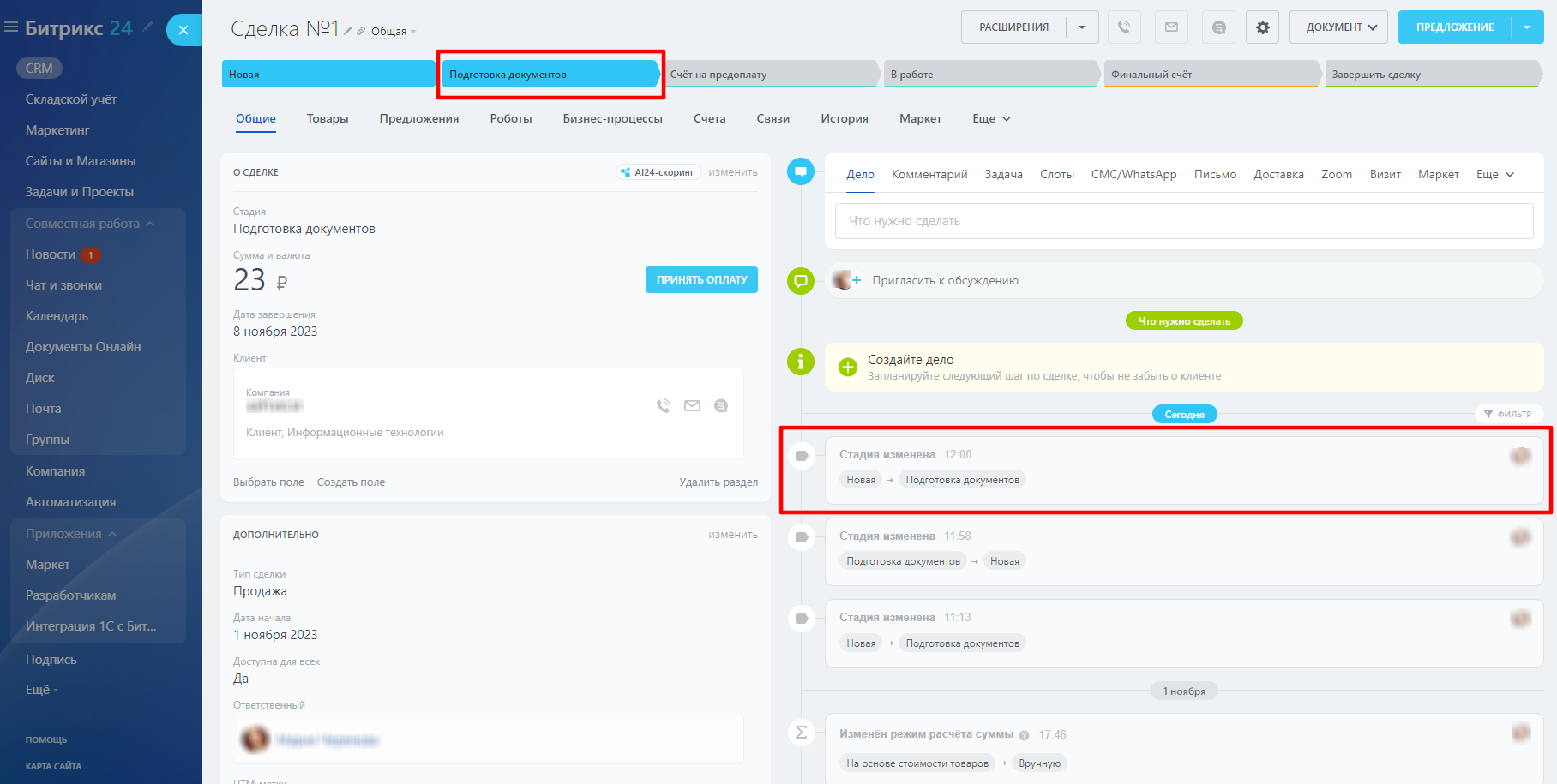 Заходим в Битрикс24 и видим, что там поменялся этап: