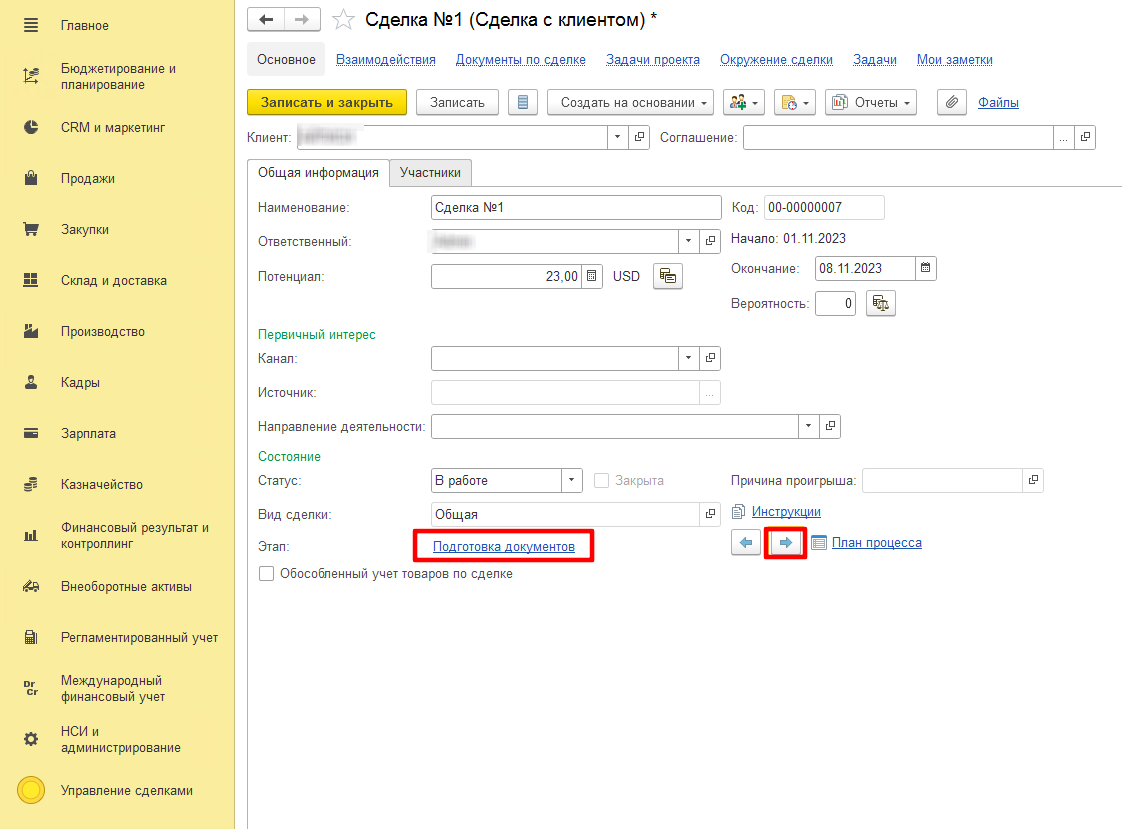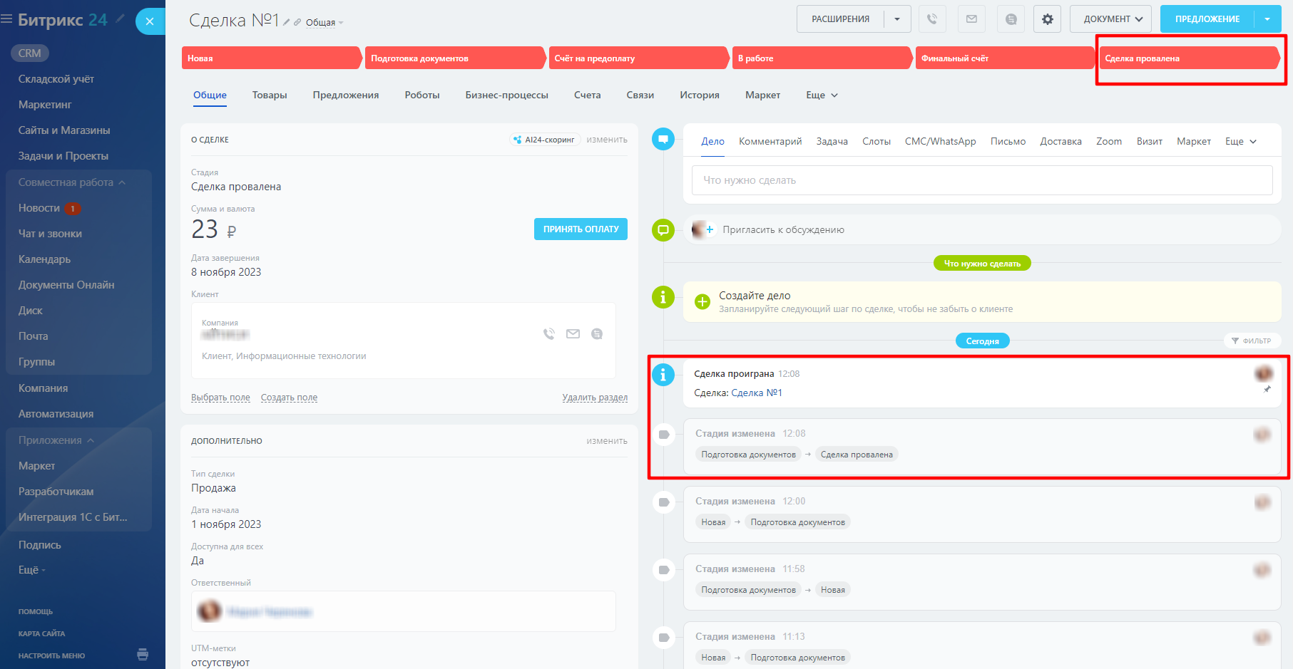 Предположим, что сделка проиграна, нажимаем «Завершить сделку» с этапом «Сделка провалена»: