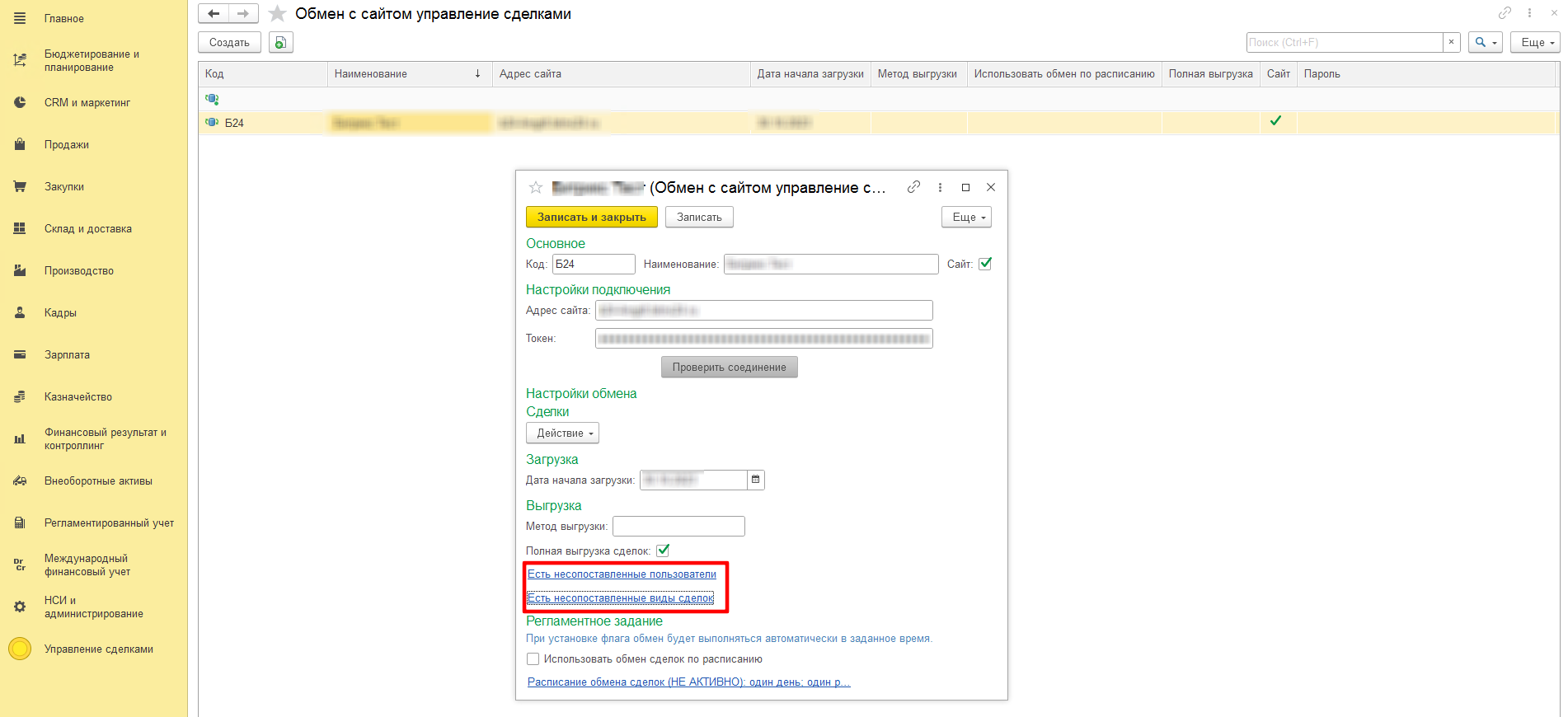 Важно! Для того, чтобы обмен работал корректно необходимо сопоставить пользователей, виды и этапы процессов продаж, сделать это можно на вкладке «Управление сделками» на форме «Обмен с сайтом управление сделками»: