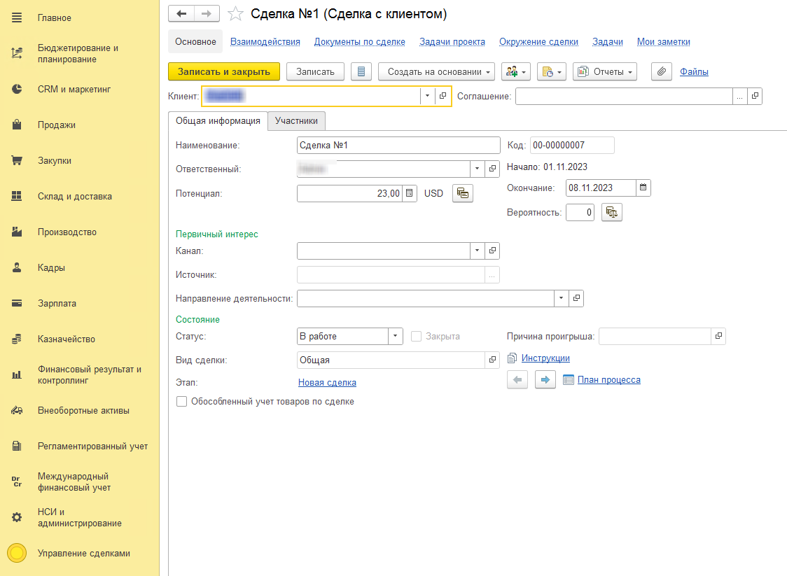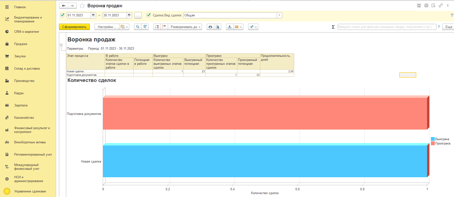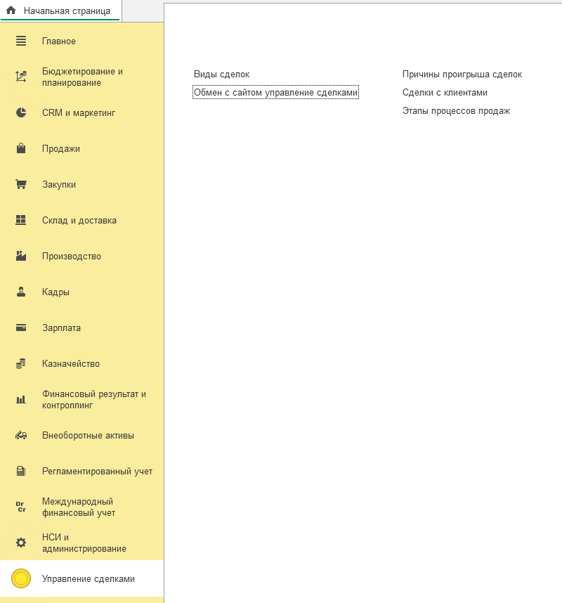 Сделки являются главным функционалом данной разработки. После установки и настройки (подробнее описано в инструкции), в 1С у нас появляется вкладка «Управление сделками», которая выглядит так: