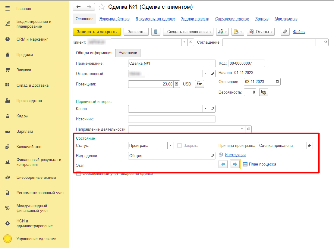 Смотрим в 1С, видим, что статус и причина проигрыша поменялись:
