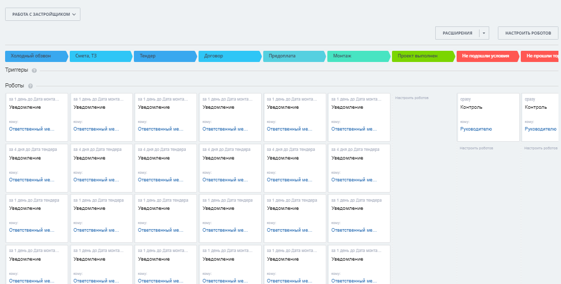 - Направление «Работа с застройщиком» в сделках позволяет организовать работу по тендерам от застройщиков и контролировать этапы работ.