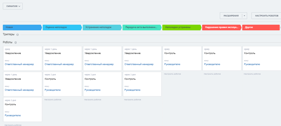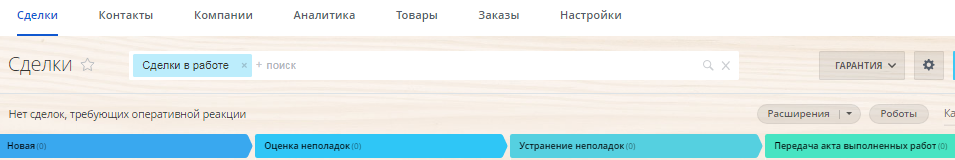 - Отдельная воронка для работы с гарантийными случаями, включающая стадии: Оценка неполадок, Устранение неполадок, Передача актов выполненных работ, Неполадки устранены.