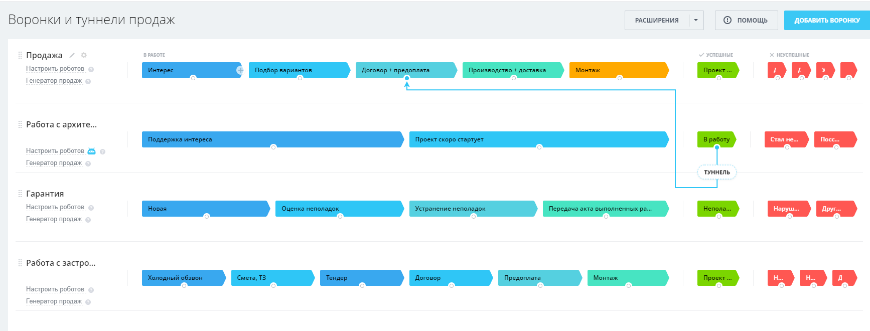 - Туннель продаж предназначен для автоматической связи двух направлений: «Работа с архитектором» и Продажа». Успешная сделка с архитектором автоматически формирует сделку в основной воронке.