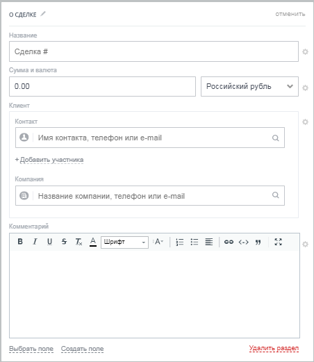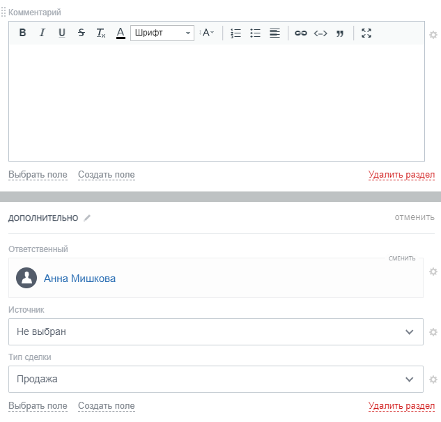 - Поля в карточке сделок работы с застройщиком включают: Название, Сумма, Клиент, Комментарий, Дата начала, Тип сделки, Источник, Ответственный.