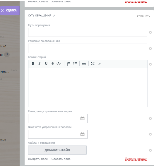 - Файлы обращения, поле для фиксации всех файлов по обращению клиента;