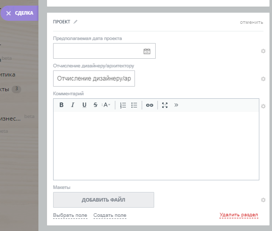 - Отчисления дизайнеру/архитектору, числовое поле для фиксации отчислений по новому проекту дизайнера/архитектора.