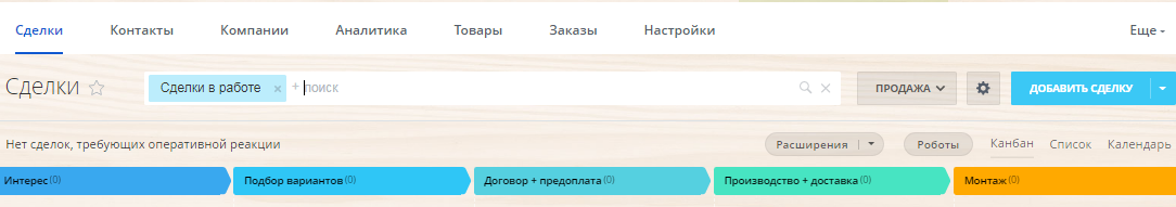 - Готовая воронка продаж со стадиями: Интерес; Подбор вариантов, Производство + доставка, Монтаж, Проект выполнен.