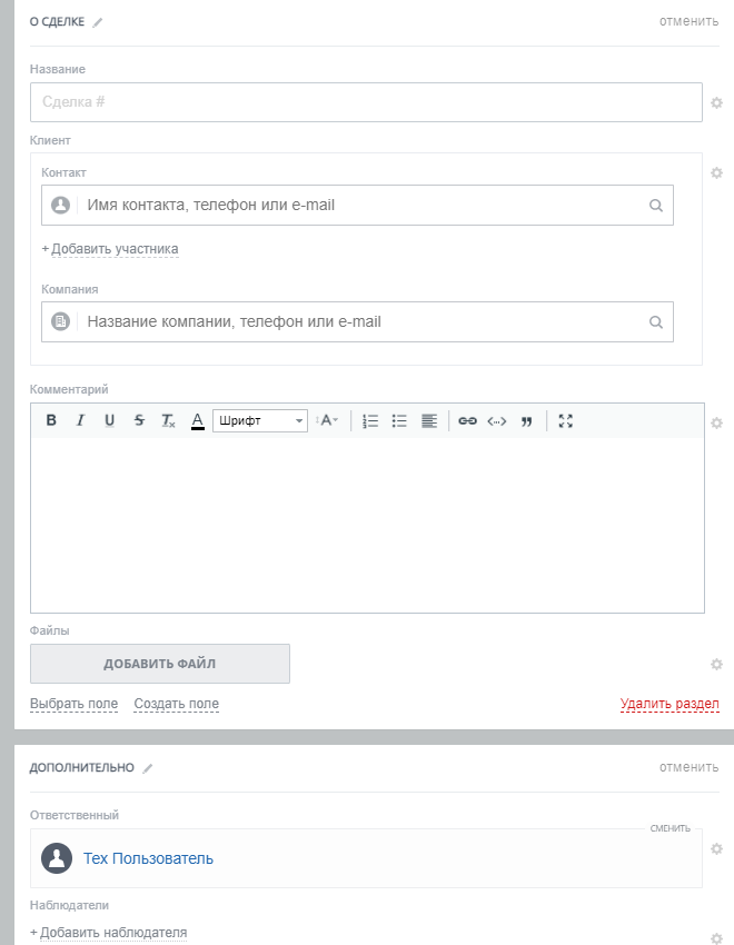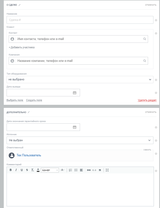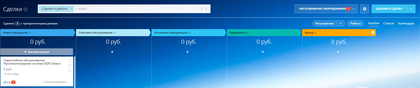 Если сделка была завершена успешно, система автоматически создаст новую сделку в направлении «Обслуживание оборудования».