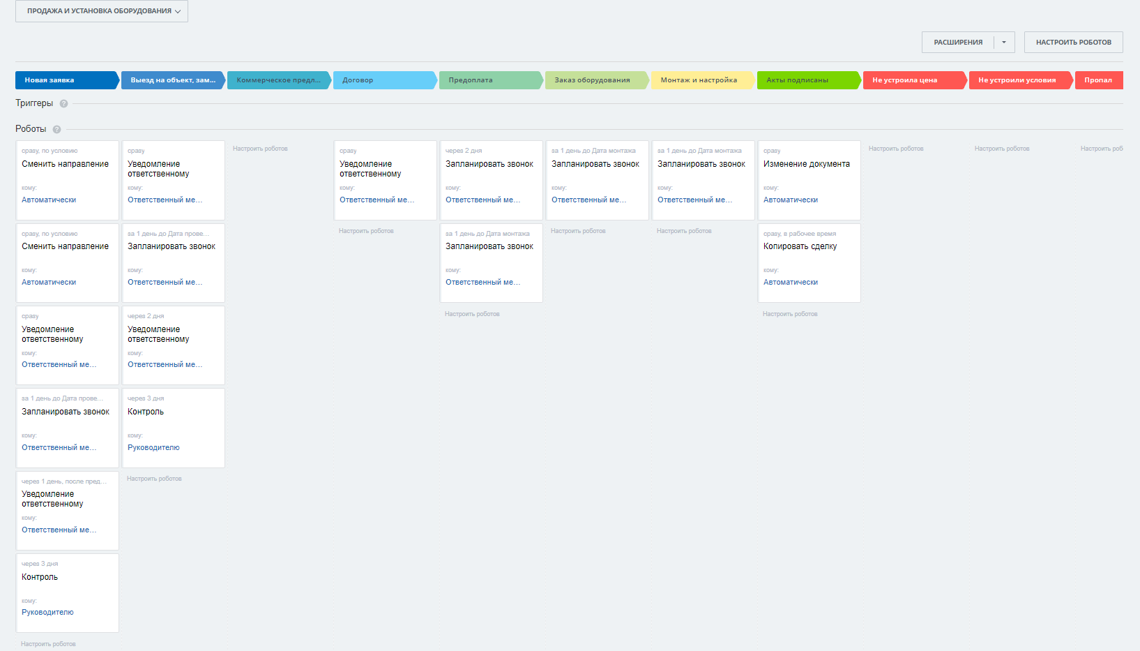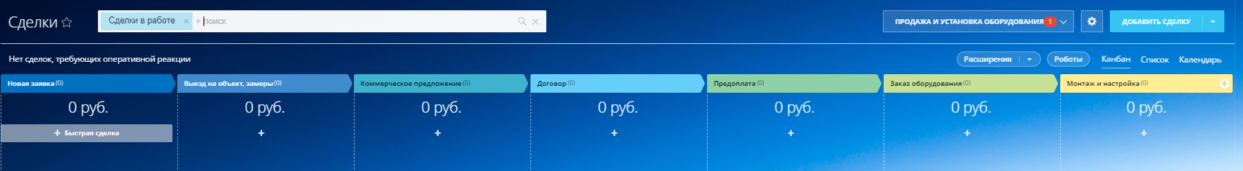 Блок включает в себя готовую воронку со стадиями: «Новая заявка», «Выезд на объект, замеры», «Коммерческое предложение», «Договор», «Предоплата», «Заказ оборудования», «Монтаж и настройка», «Акты подписаны». Подходит как для ведения всех заявок на продажу оборудования, так и для отслеживания работ по его монтажу и настройке (при помощи инструмента «Задачи и проекты»).