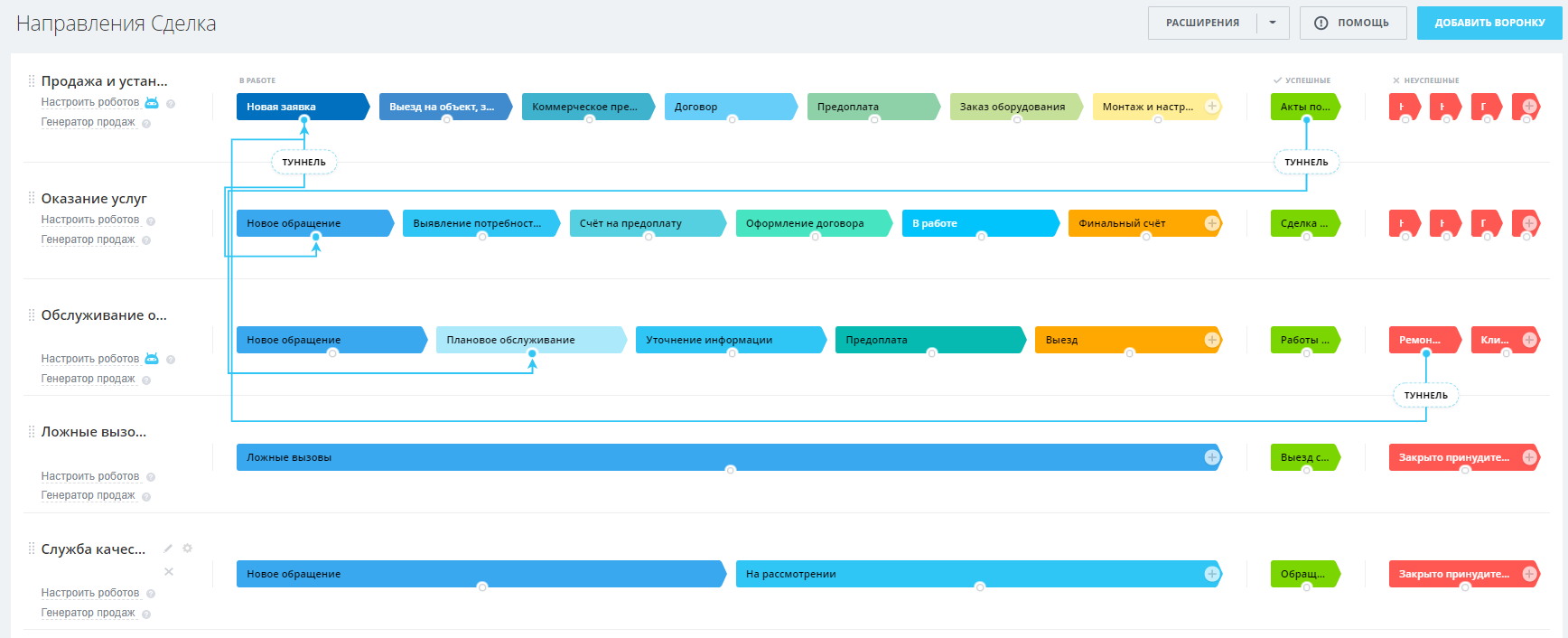 Включает в себя следующие стадии: «Новое обращение», «Выявление потребностей», «Cчёт на предоплату», «Оформление договора», «В работе», «Финальный счёт», «Сделка успешна».