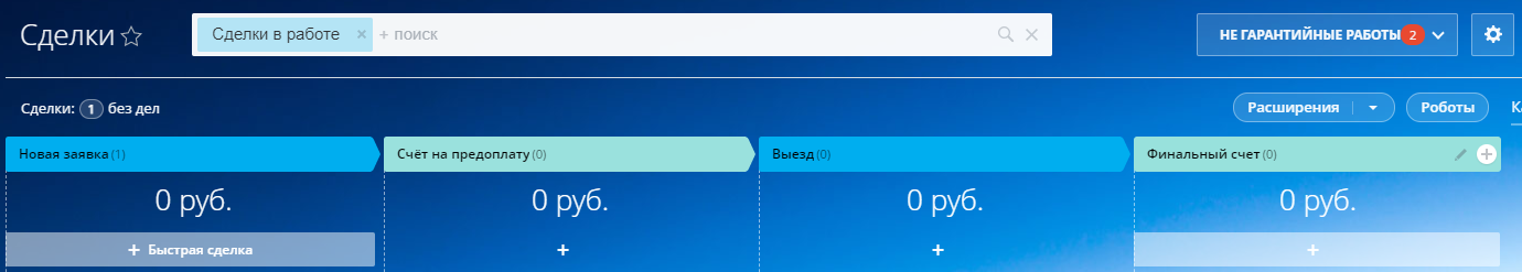 Отдельная воронка для сервисного обслуживания (работы не по гарантии), включающая этапы: Новая заявка, Счет на предоплату, Выезд, Финальный счет, Услуга оказана.