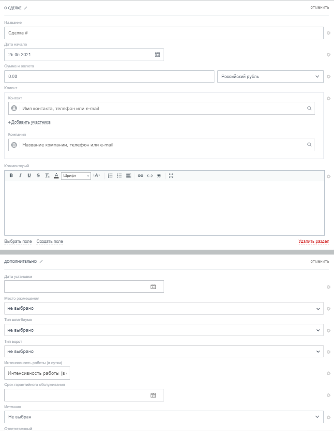 Карточка сделки для сервисного обслуживания состоит из полей: Название, Сумма, Клиент, Комментарий, Тип шлагбаума, Тип ворот, Интенсивность работы (в сутки), Дата выезда, Срок гарантийного обслуживания, Ответственный.