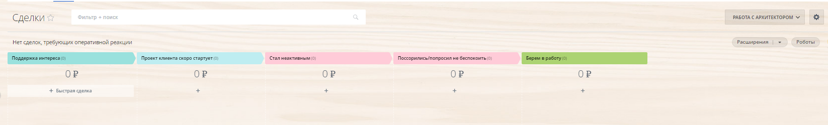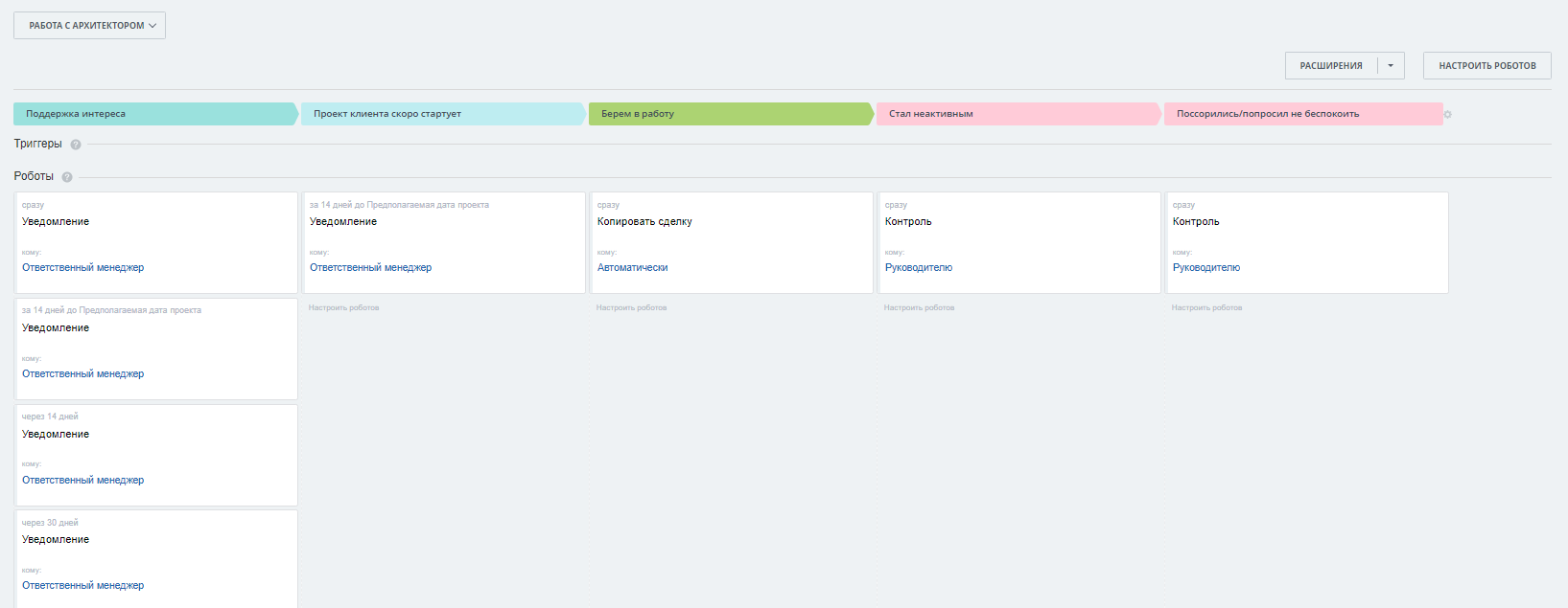 - Туннель продаж предназначен для автоматической связи двух направлений: «Индивидуальный проект» и «Работа с архитектором». Успешная сделка с архитектором автоматически попадает в основную воронку.