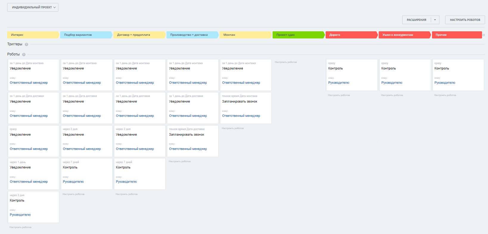 Для неуспешных сделок предусмотрены специальные стадии. В направлении «Индивидуальный проект»: Дорого, Ушёл к конкурентам, Прочее. В направлении «Работа с архитектором»: Стал неактивным и Поссорились/попросил не беспокоить. И в направлении «Гарантийный случай»: Нарушение правил эксплуатации, Другое.