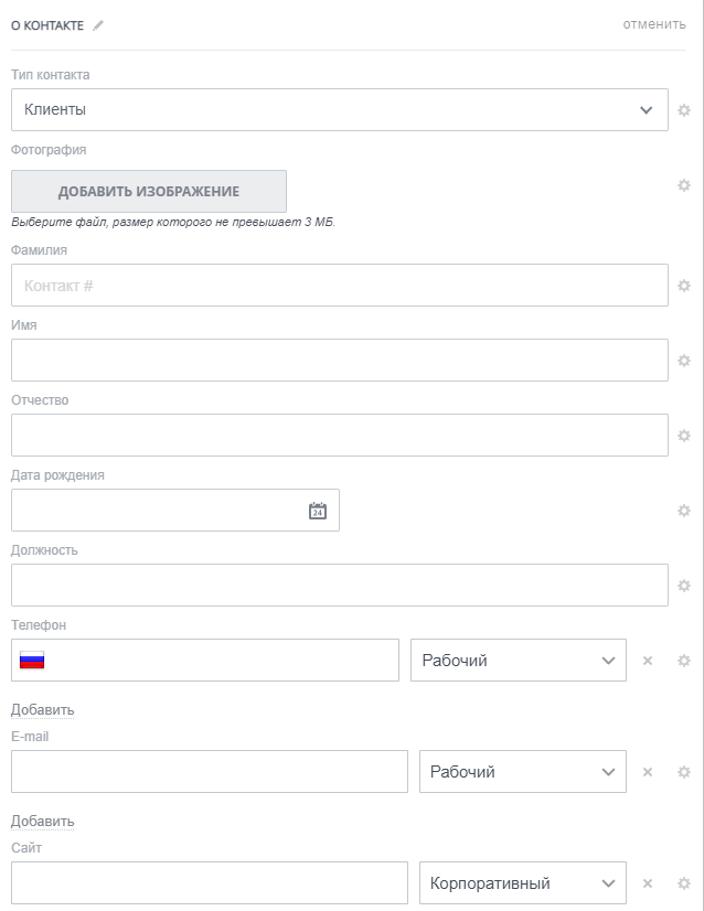 - Заранее настроенные типы рабочих контактов: Клиенты, Архитекторы, Прорабы, Поставщики.