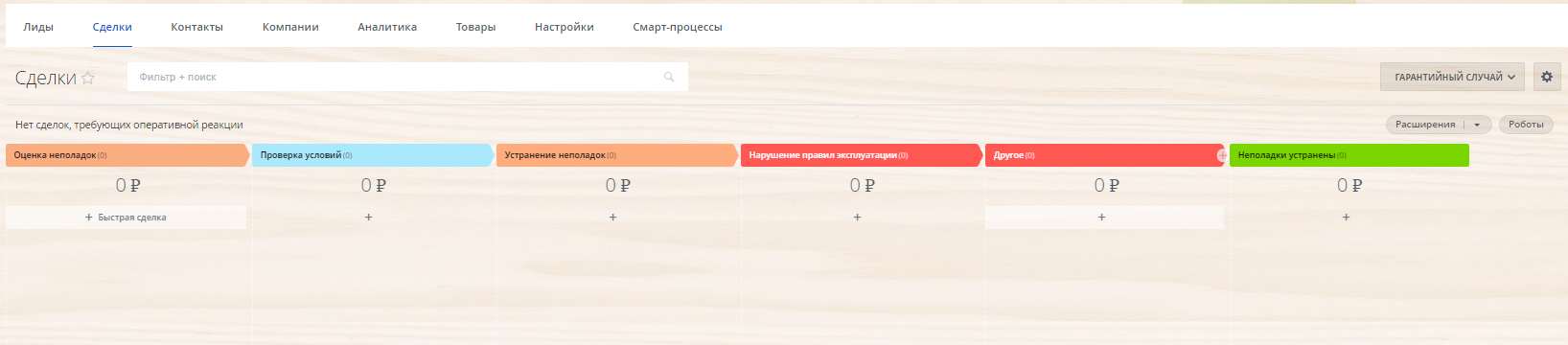 - Отдельная воронка для работы с гарантийными случаями, включающая этапы: Оценка неполадок, Устранение неполадок, Передача актов выполненных работ.