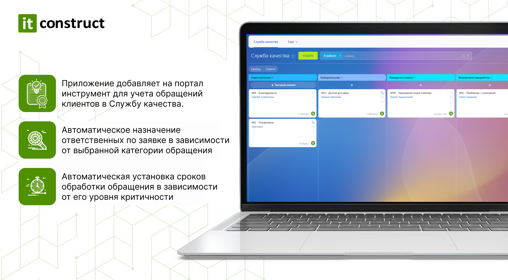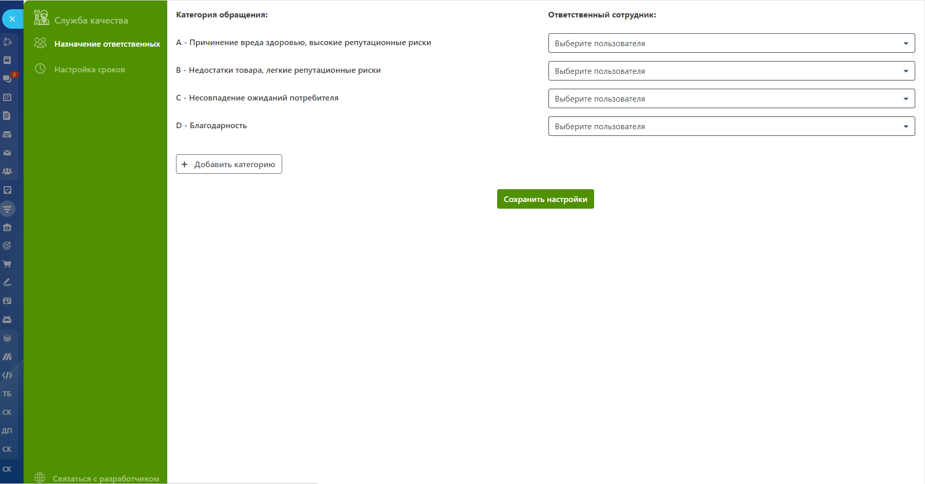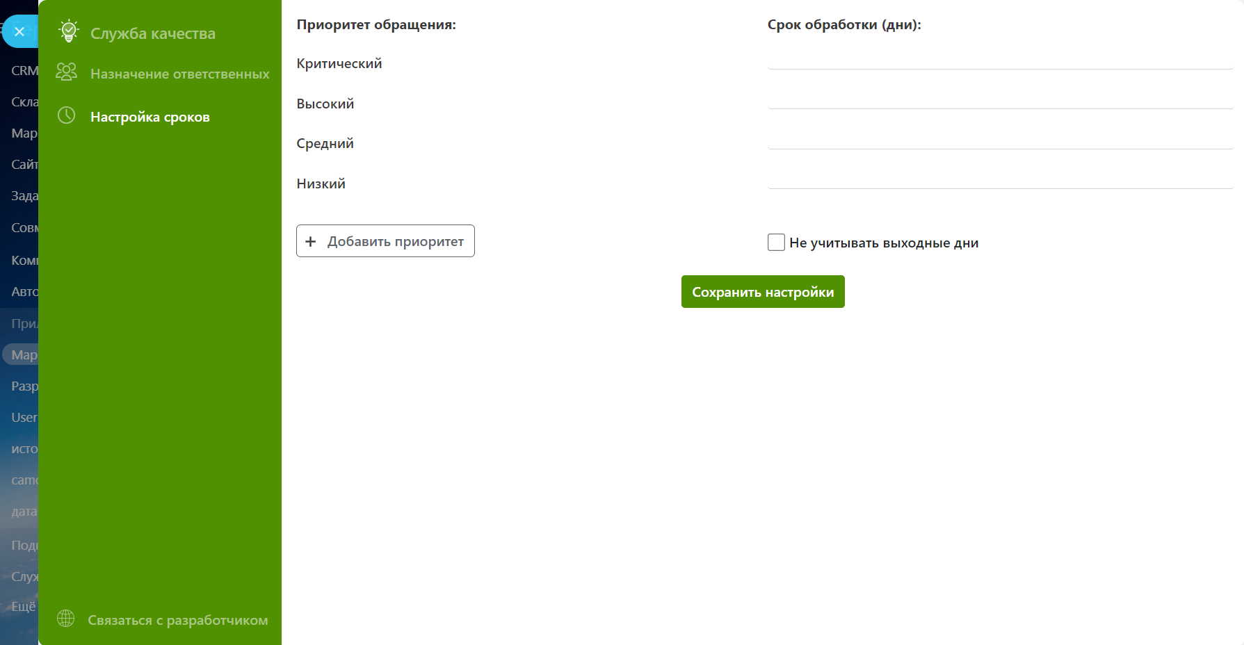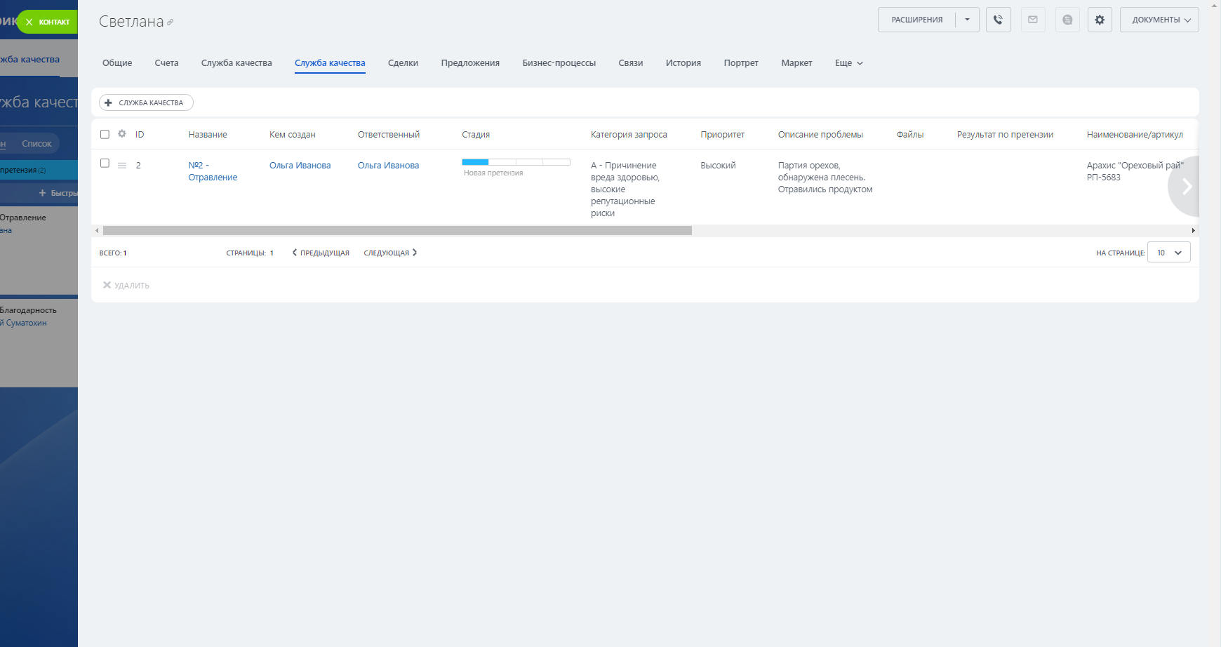 Данный модуль позволяет создать новый раздел, в котором вы сможете вести работу с обратной связью клиентов. Любая заявка клиента (в соцсети, мессенджеры, по почте и телефону) может быть выделена в отдельный элемент - запись в разделе "Служба качества".