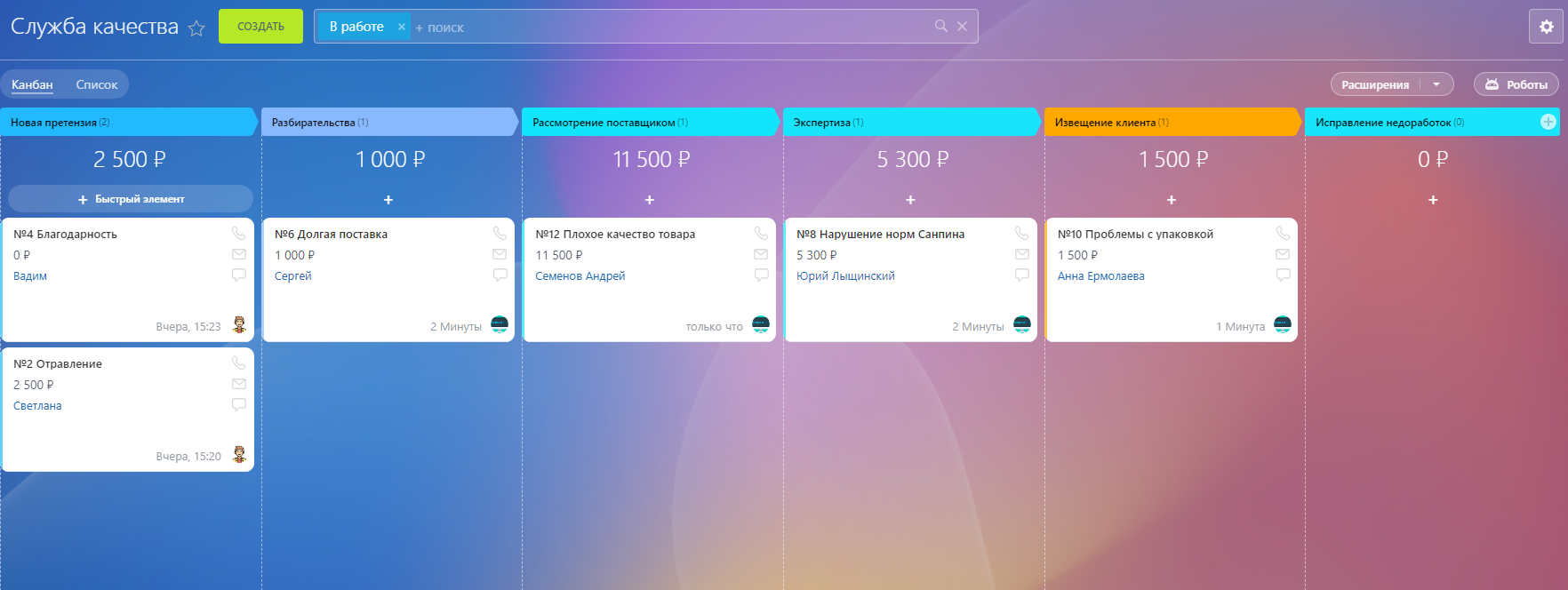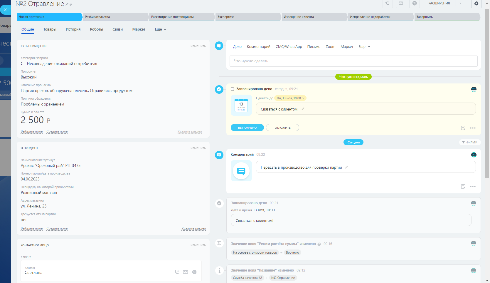 Мы выделили и настроили основные этапы работы с претензиями от клиентов: