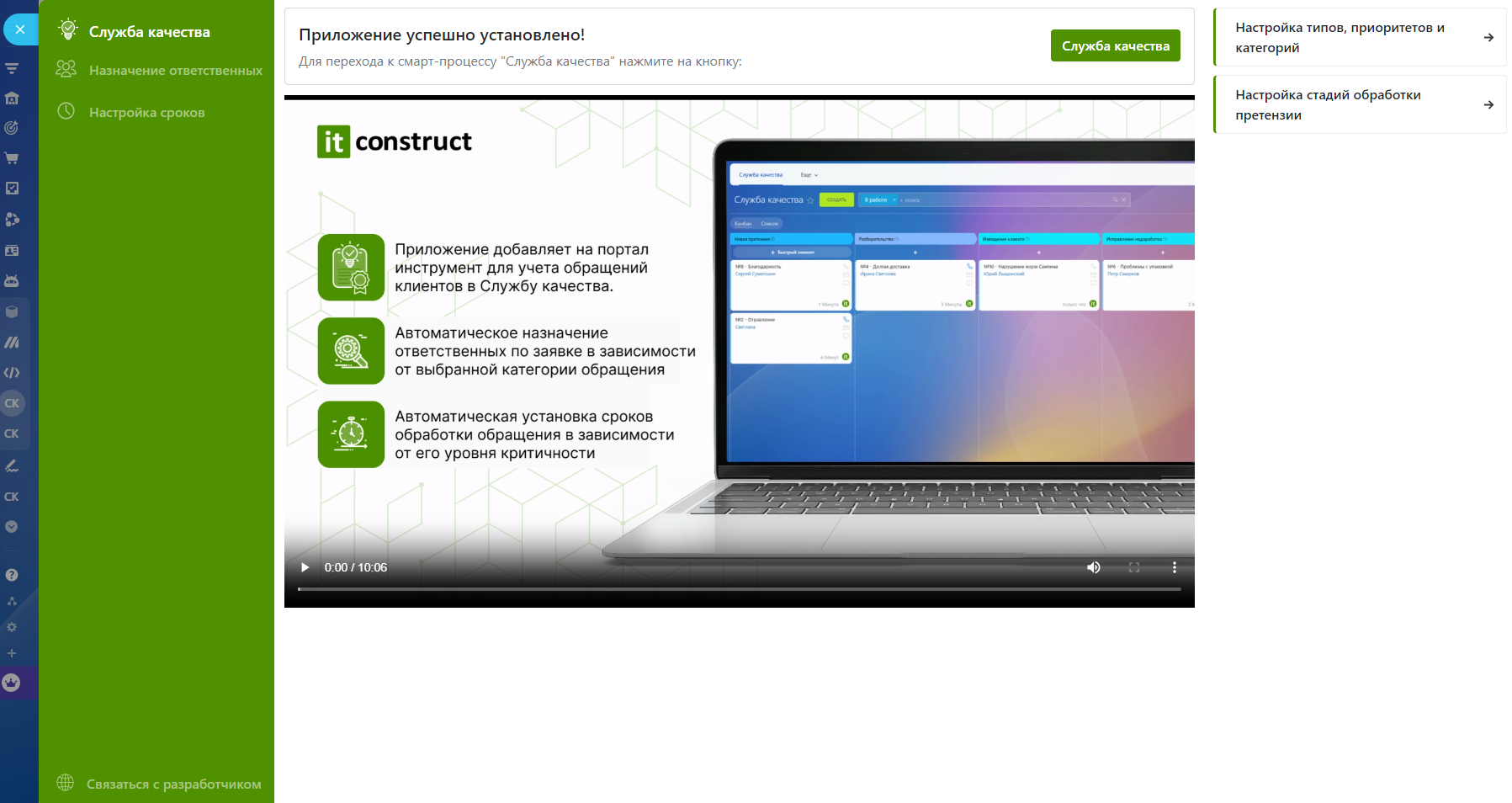 Приложение добавляет на портал инструмент для учета обращений клиентов в Службу качества и их аналитики