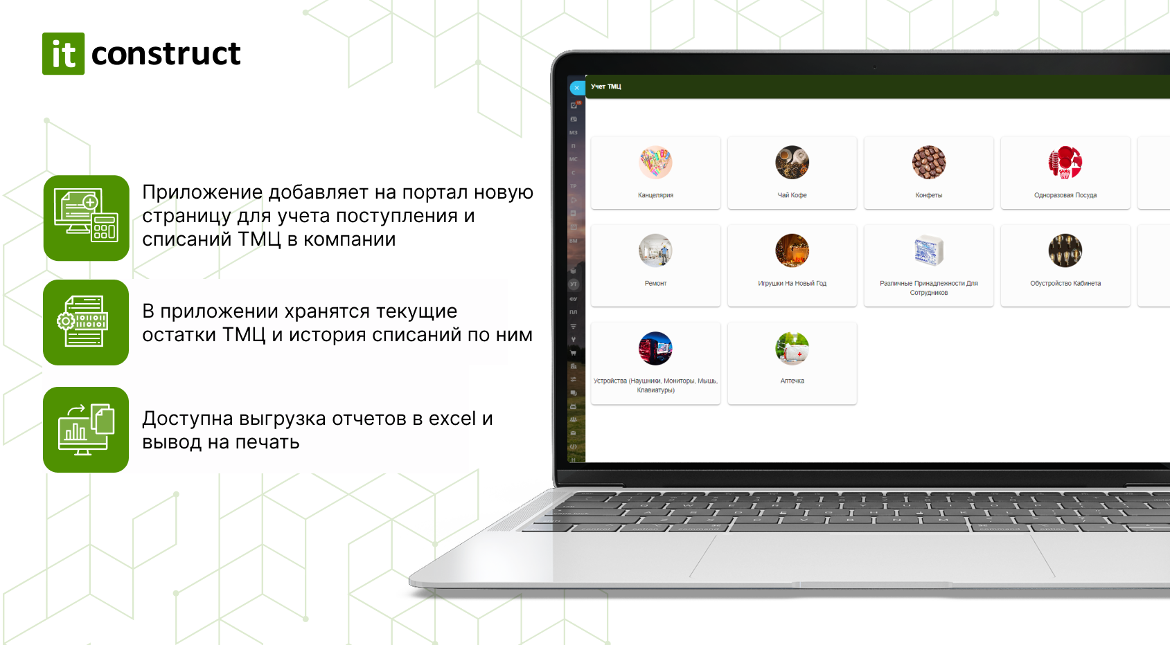 Нам очень важна обратная связь. Можете написать свои ожидания от "Учёт ТМЦ" на почту support@itconstruct.ru? Возможно, мы дополним это приложение или вообще сделаем другое.