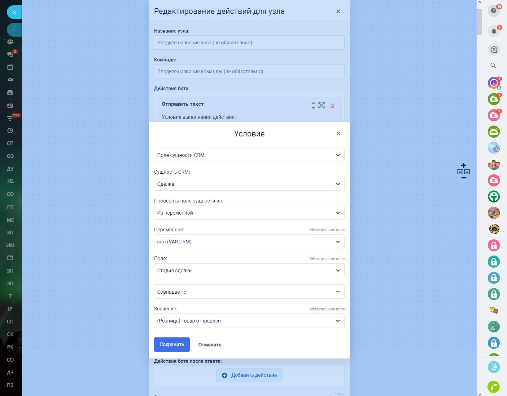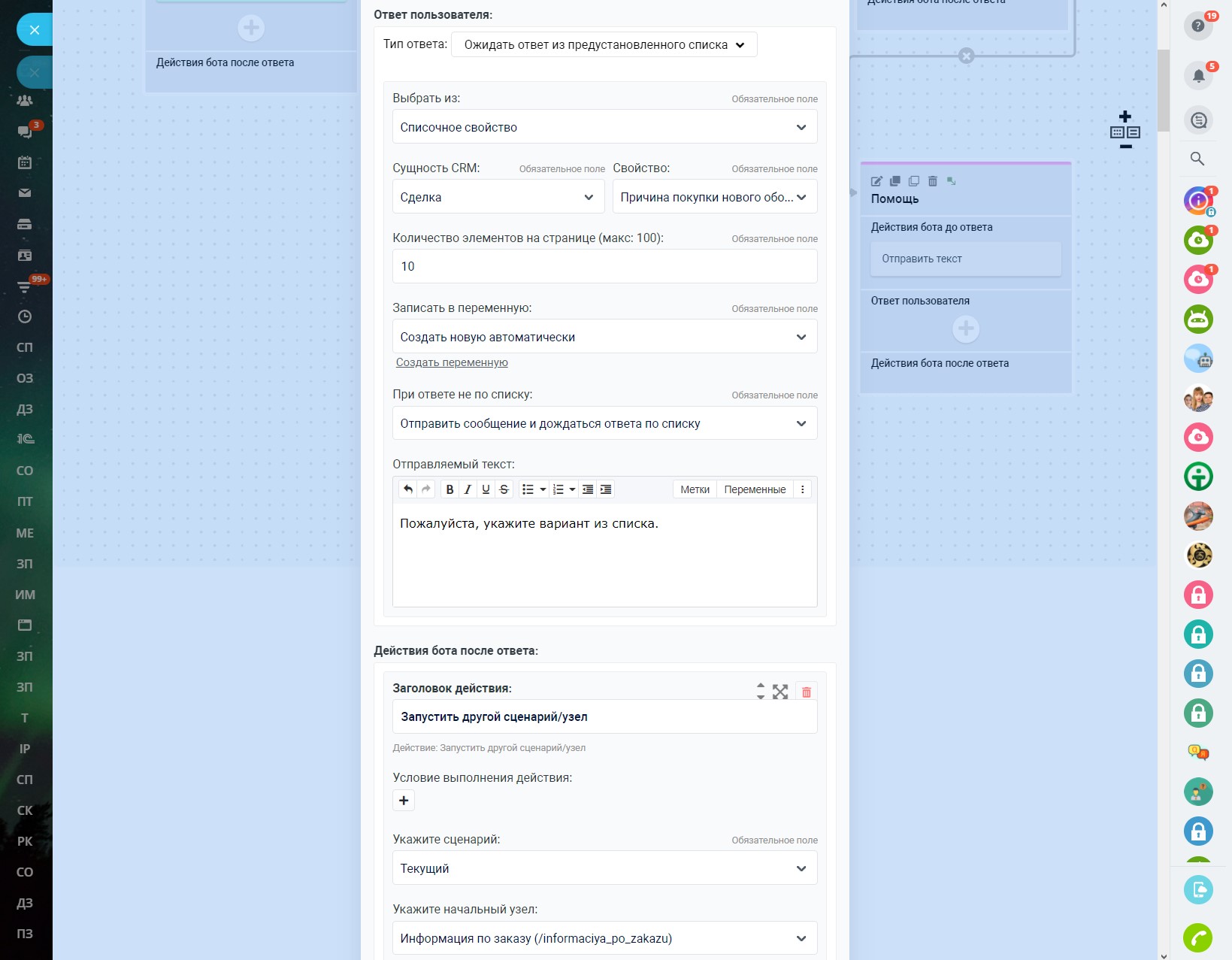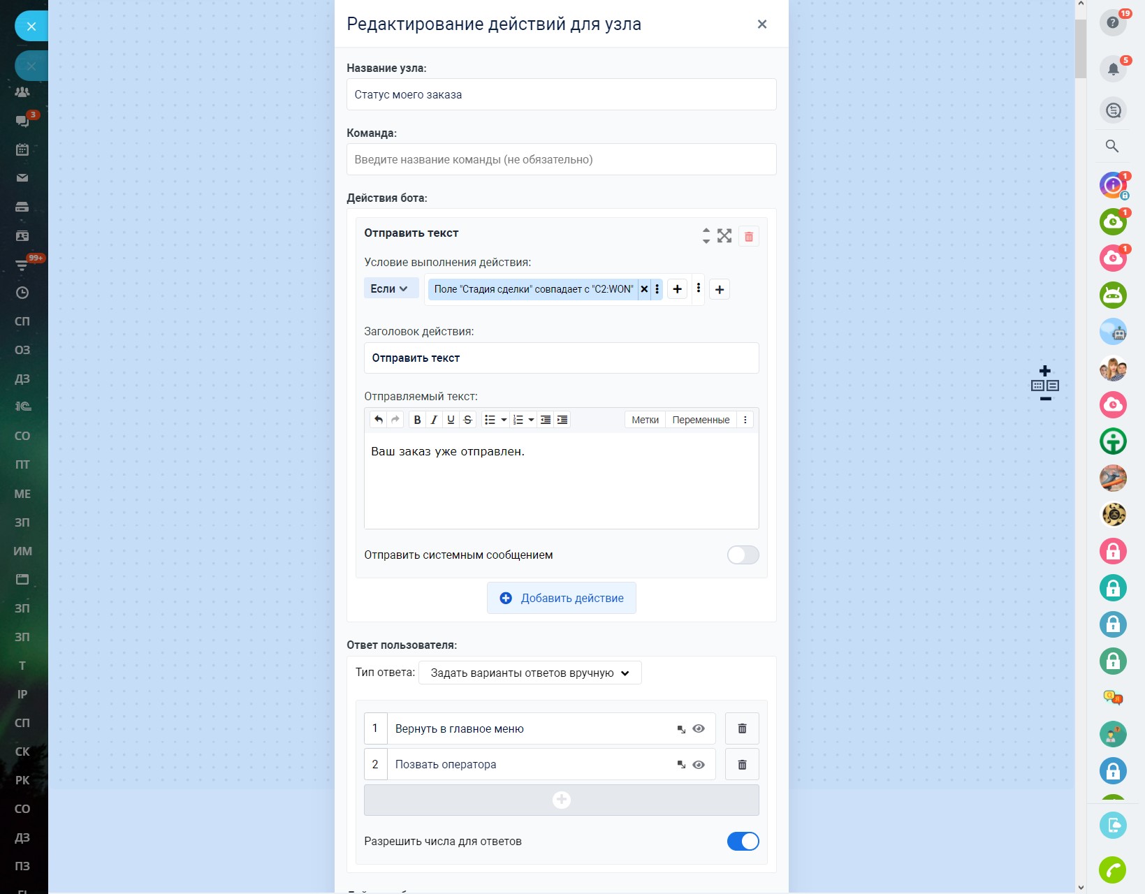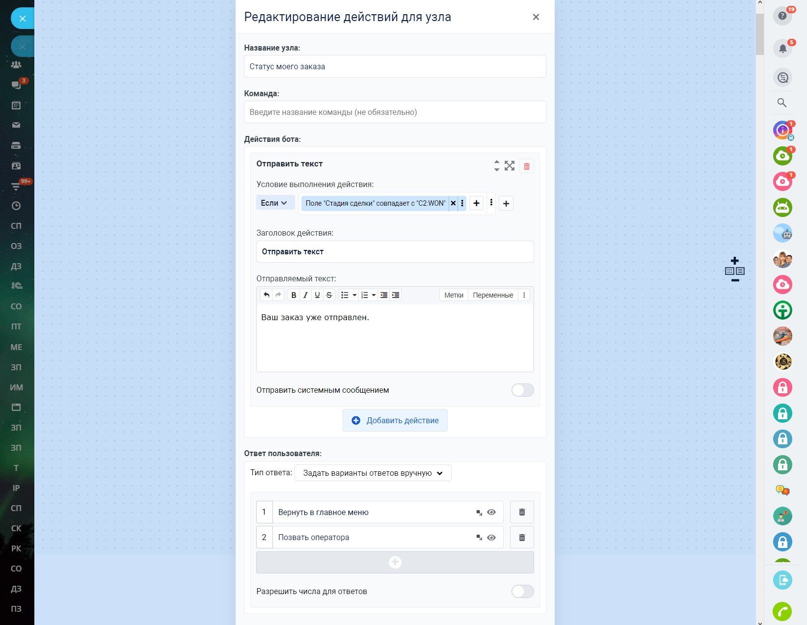 Благодаря роботам Битрикс24, наш чат-бот позволяет выполнить отдельный диалог с клиентом в мессенджере, когда сделка или лид достигают какого-либо конкретного этапа.