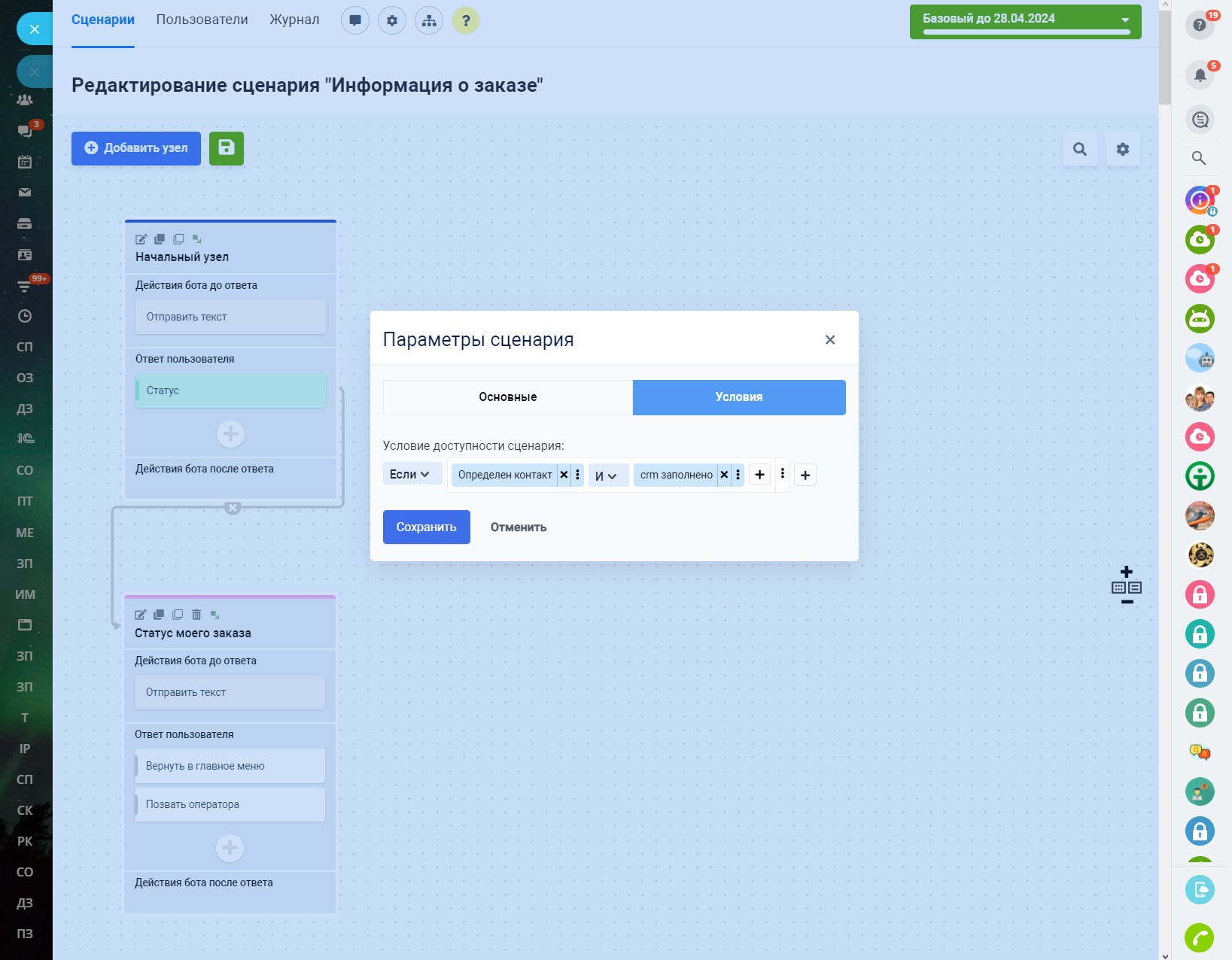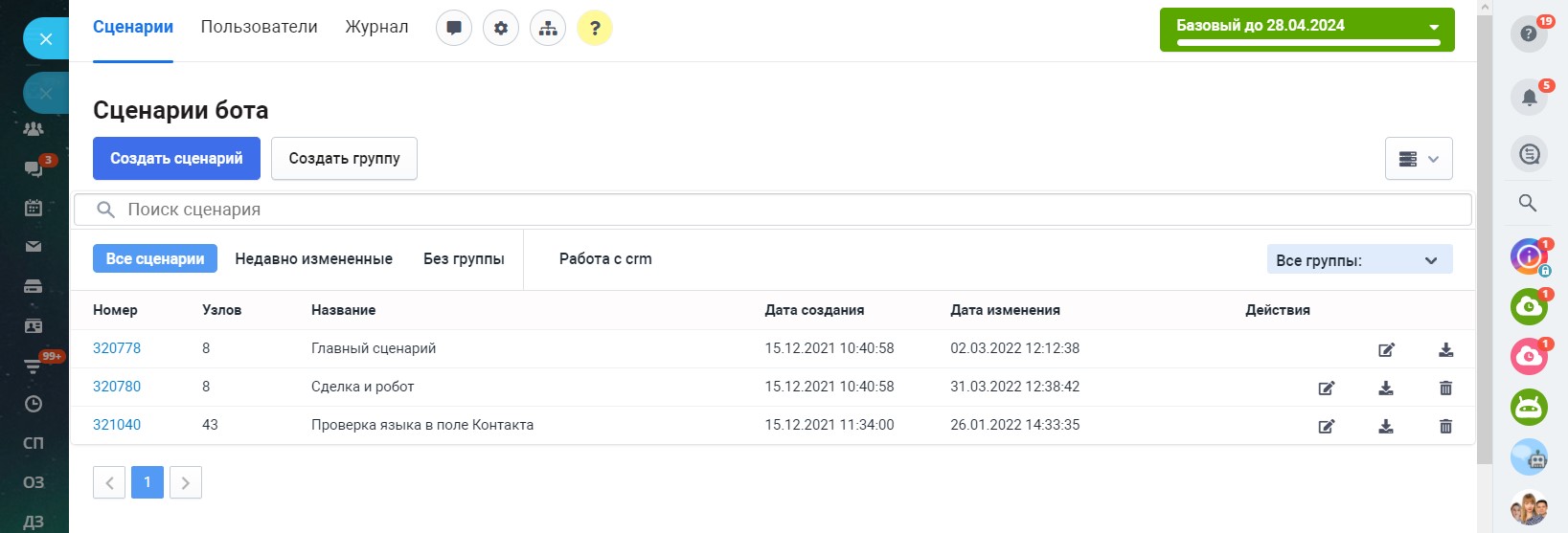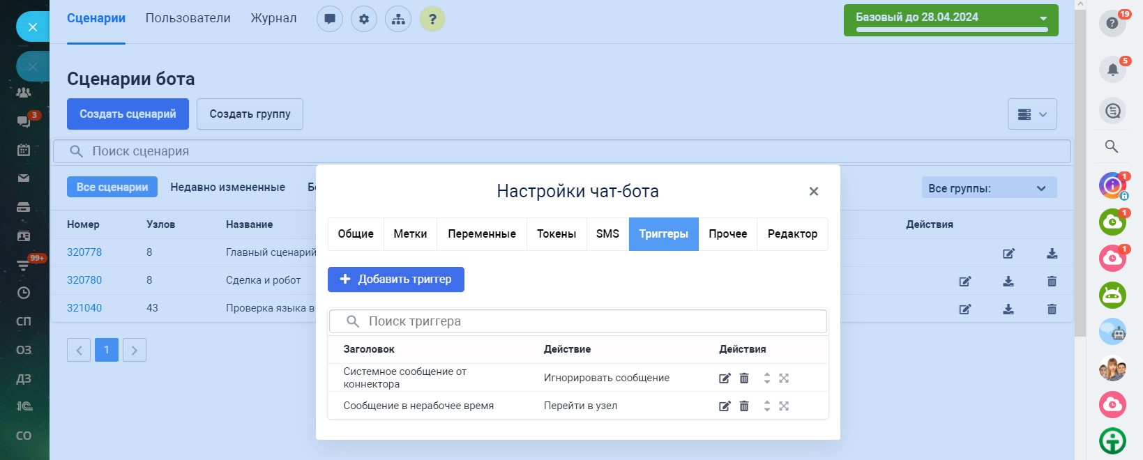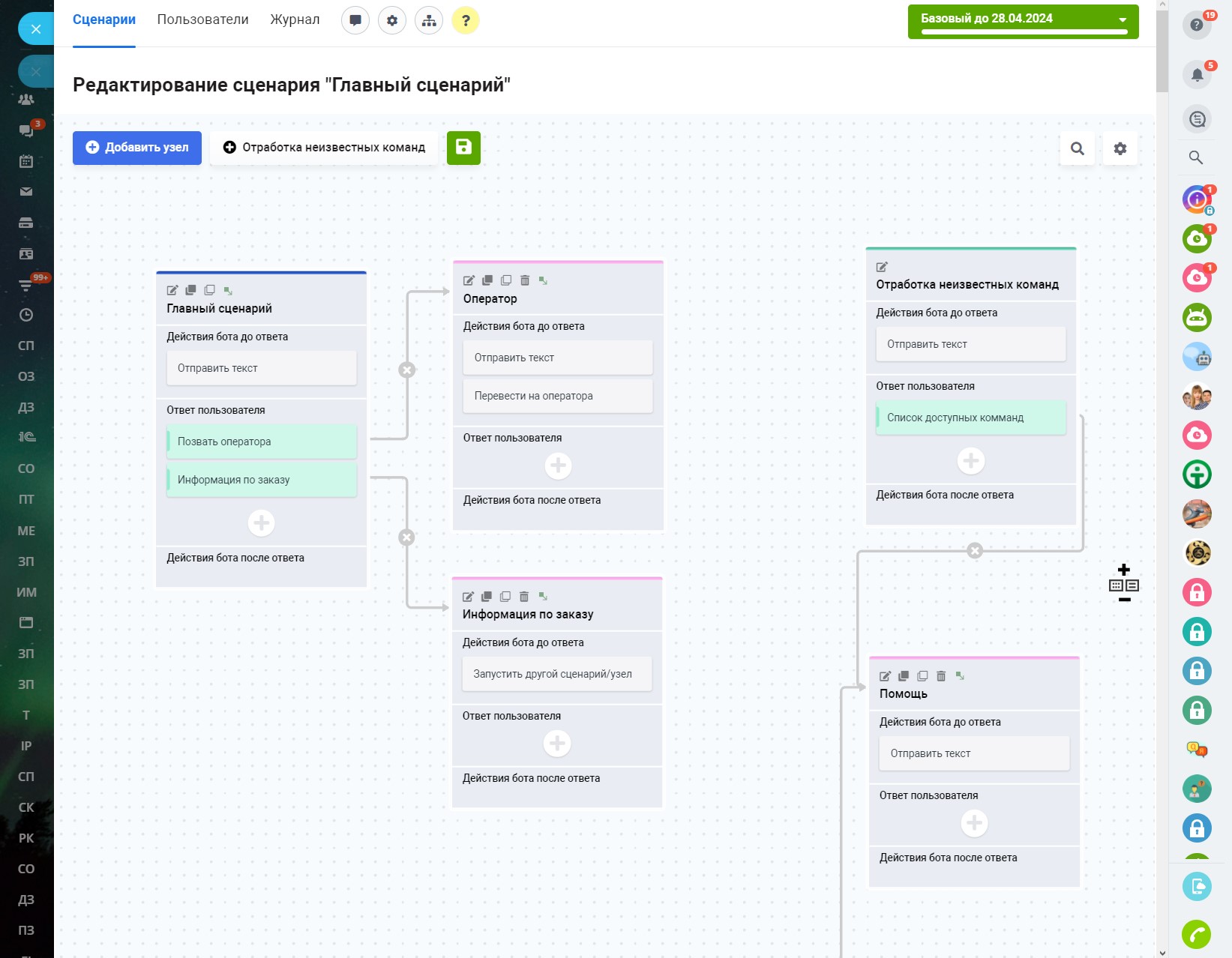 В разделе «Сценарии» по умолчанию доступен один главный сценарий, с которого чат-бот при первом обращении клиента начинает диалог. Главный сценарий нельзя удалить, но его можно изменить и создать неограниченное количество других сценариев. Запустить главный сценарий можно командой /start.