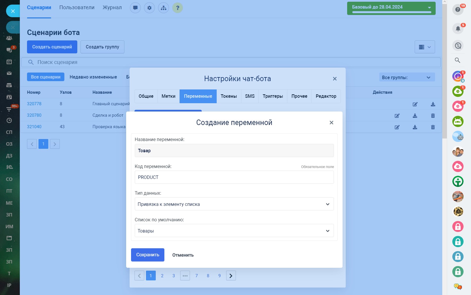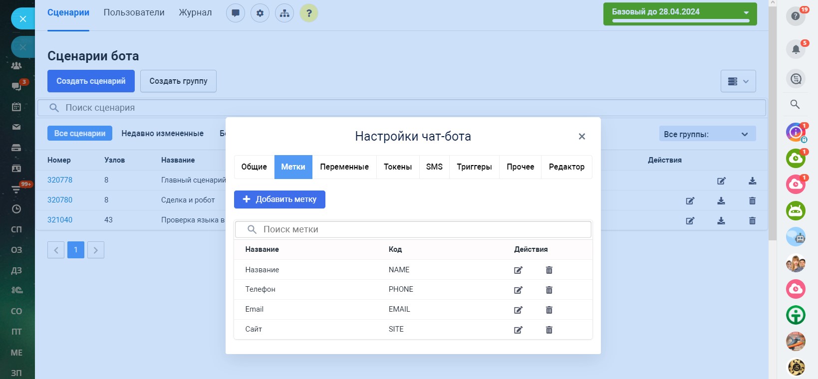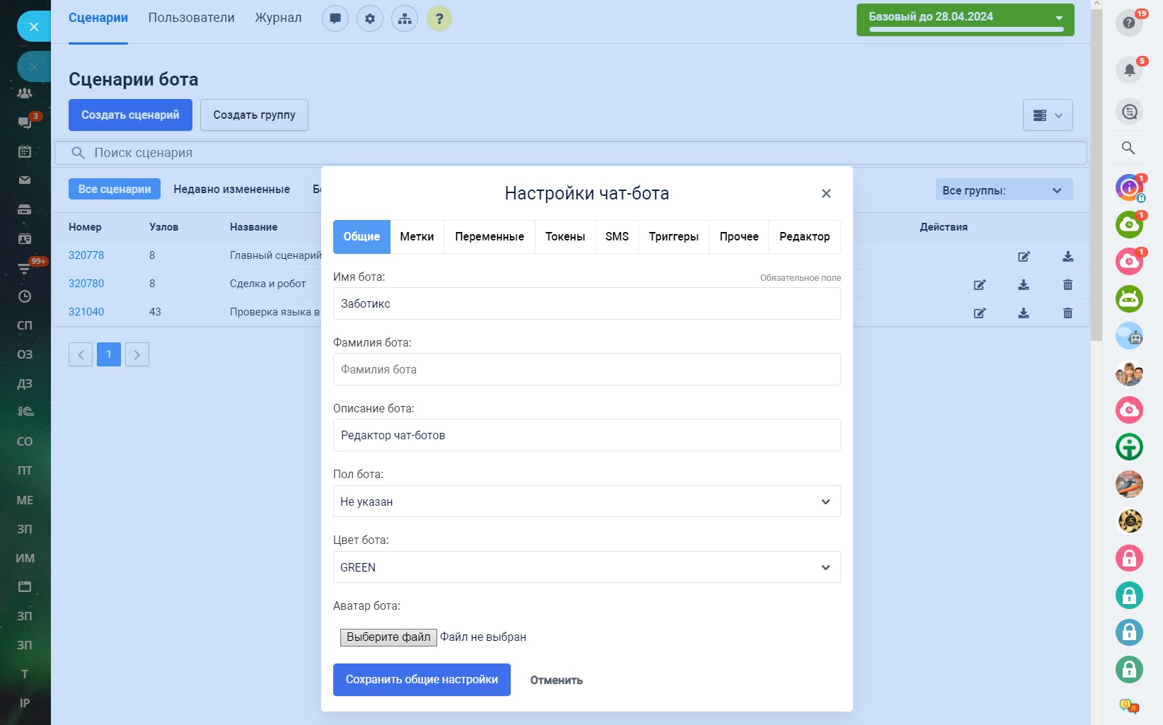В разделе «Сценарии» по умолчанию доступен один главный сценарий, с которого чат-бот при первом обращении клиента начинает диалог. Главный сценарий нельзя удалить, но его можно изменить и создать неограниченное количество других сценариев. Запустить главный сценарий можно командой /start.