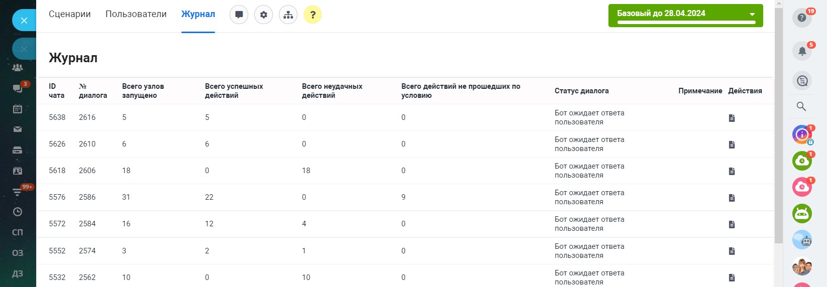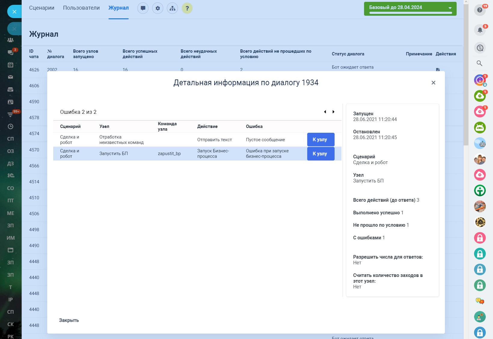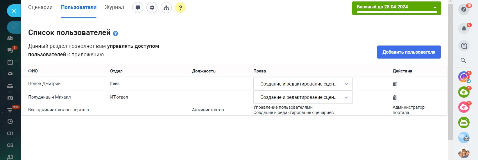 В разделе «Пользователи» представлен список пользователей, имеющих доступ к приложению. Обратите внимание, что все пользователи, являющиеся администраторами портала, имеют административный доступ к приложению и это нельзя изменить. Администратор может создавать/редактировать/удалять сценарии, управлять пользователями приложения, менять настройки.