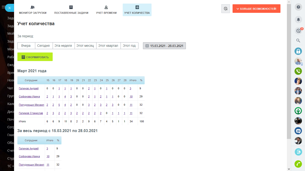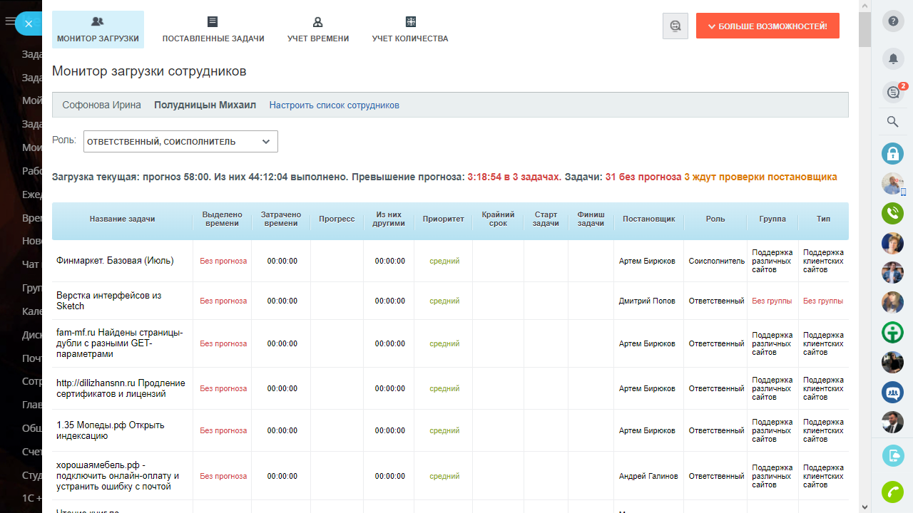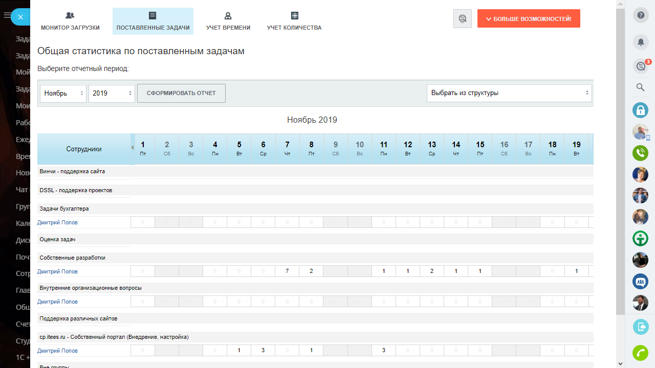 Отчеты по задачам, анализ задач сотрудника, количество задач, нагрузка на сотрудника - отслеживайте занятость сотрудников и получайте статистику по их активным в настоящий момент задачам.