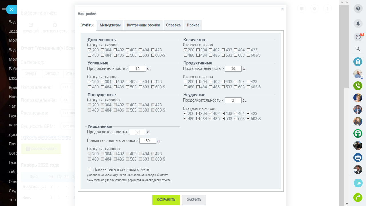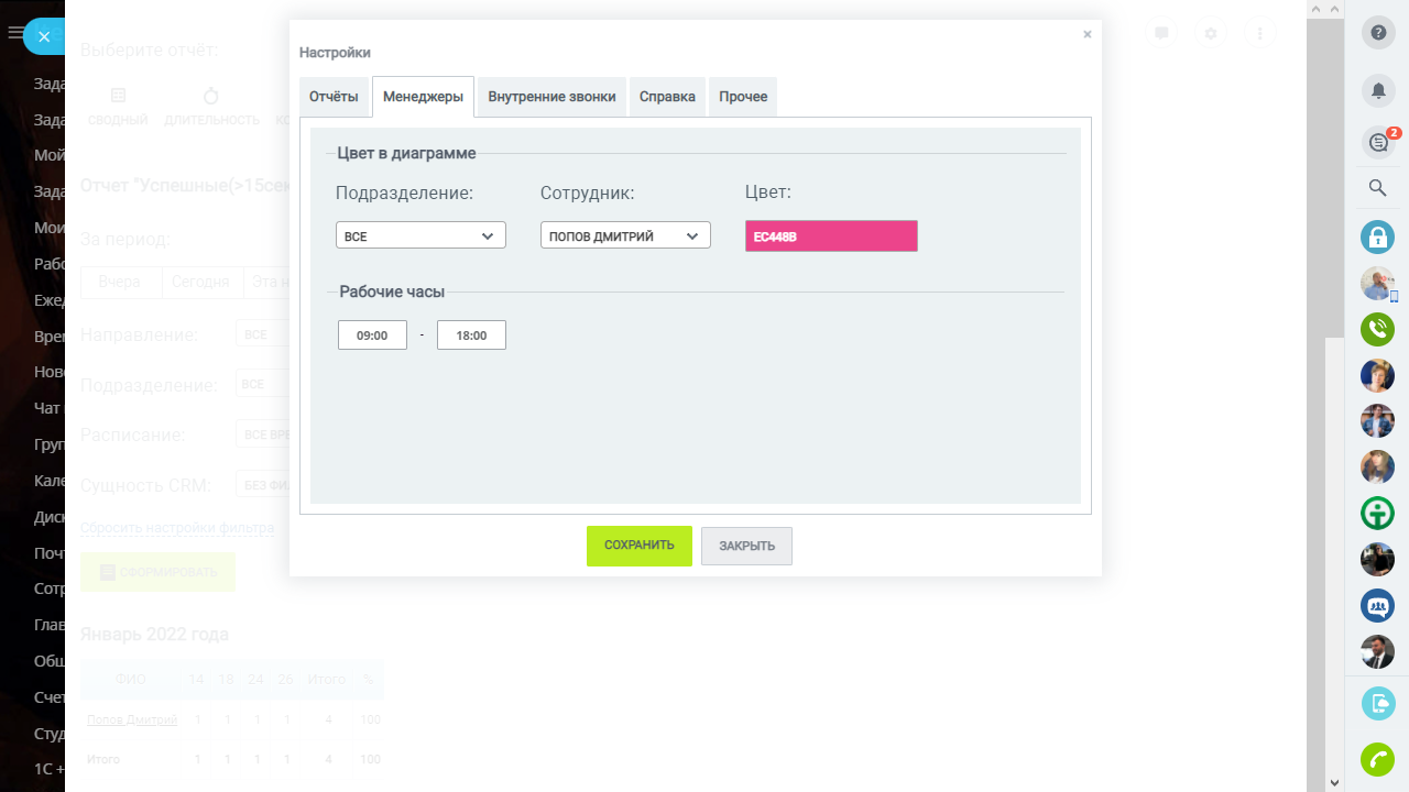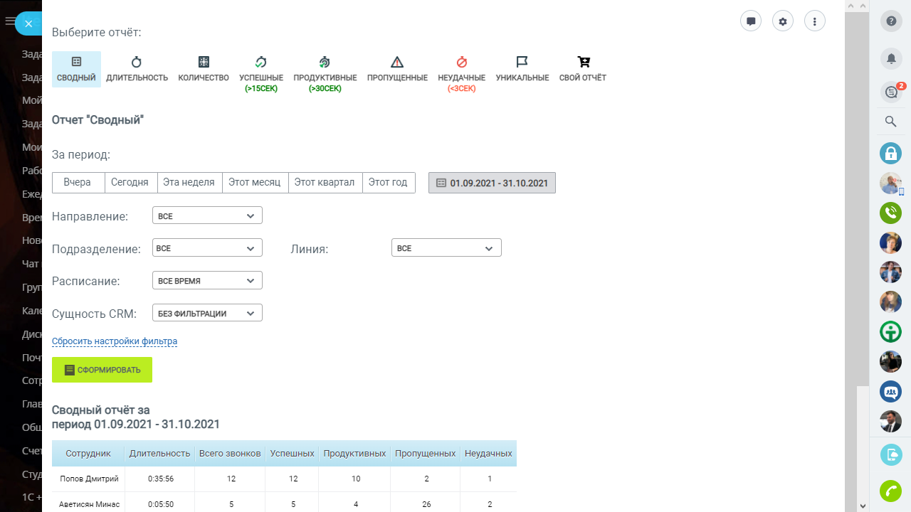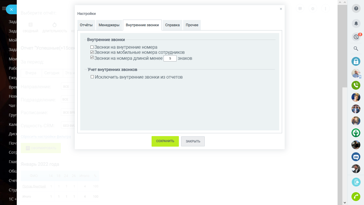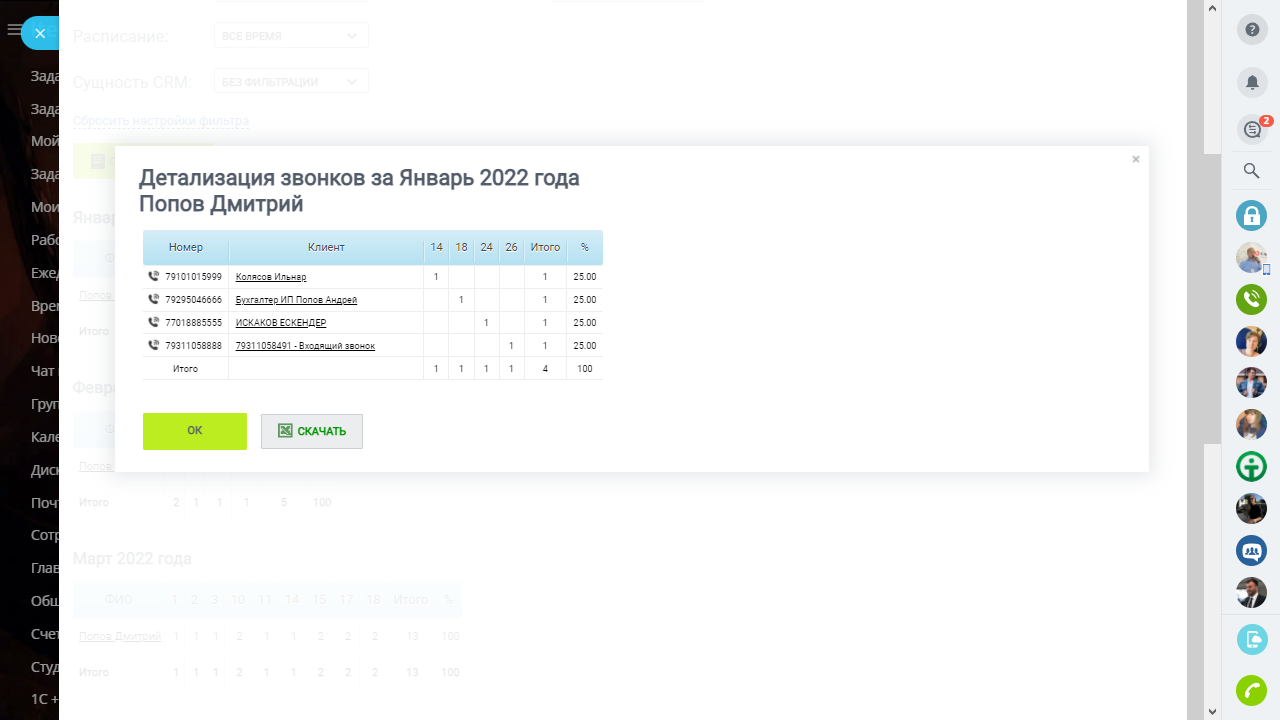 детализацию звонков сотрудника (Кликните на ФИО сотрудника в отчете)