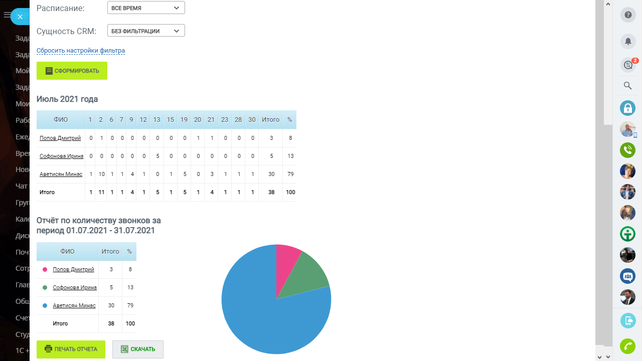 Легко и быстро посчитайте количество звонков ваших сотрудников - успешные, продуктивные, пропущенные, уникальные звонки. Смотрите детализацию звонков по сотруднику.