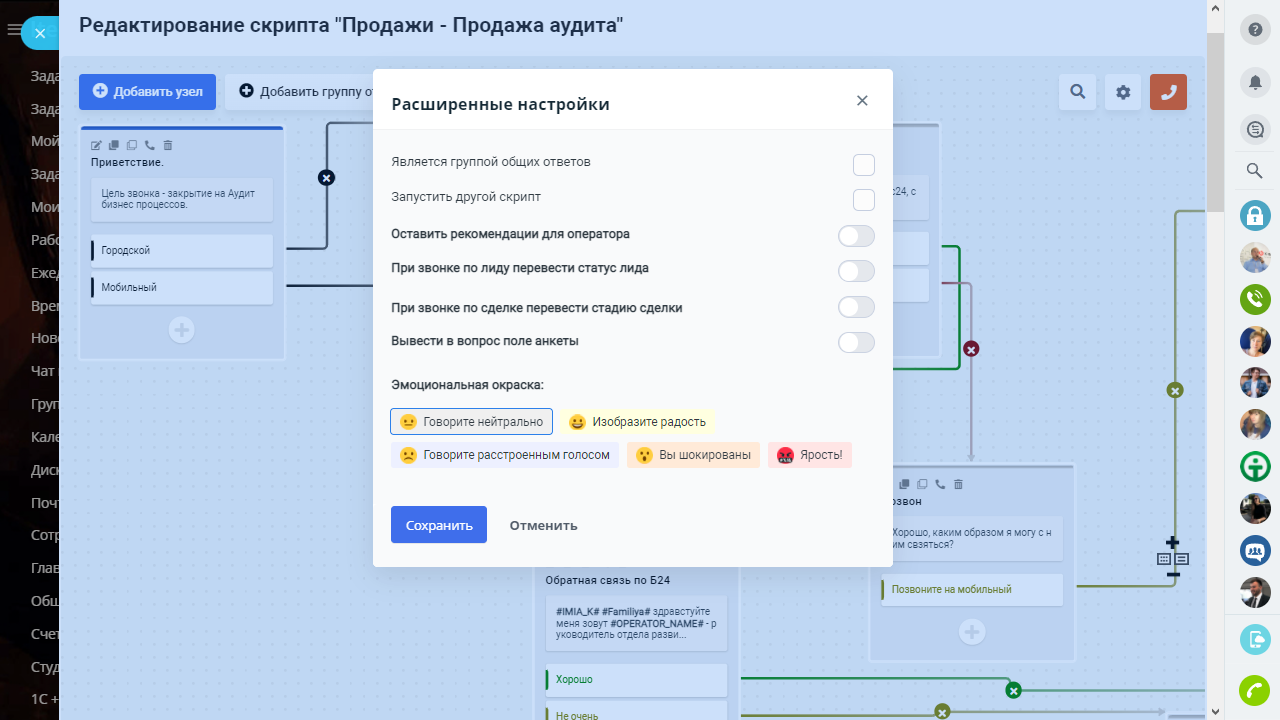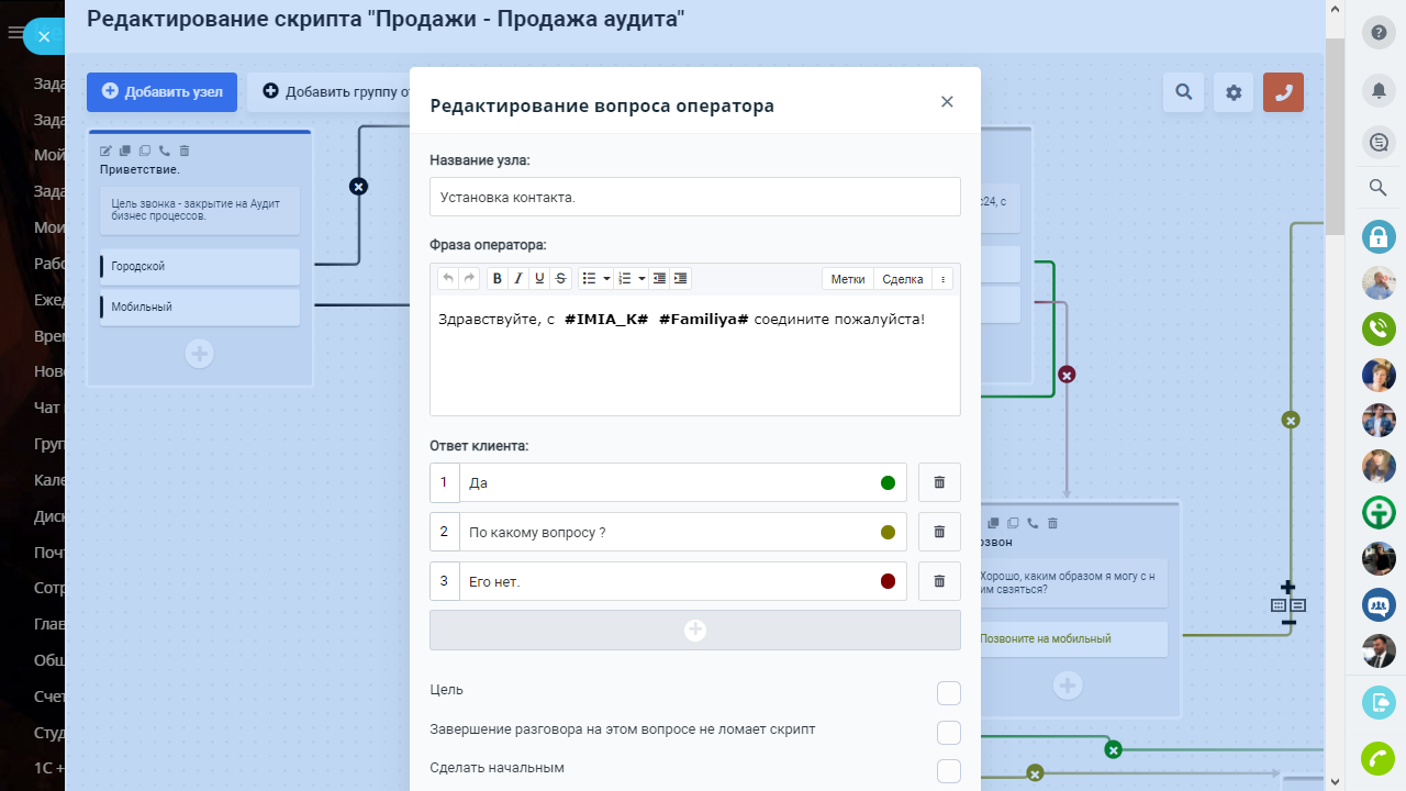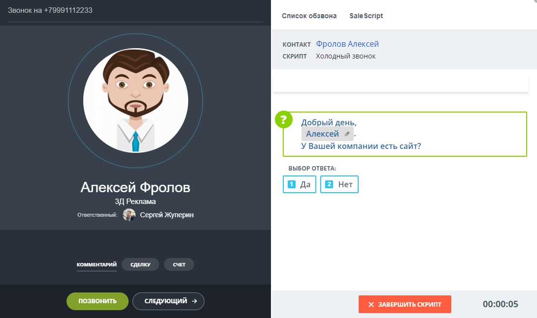 В процессе работы сотрудник может составить список клиентов и использовать скрипт прямо в окне звонка, избавляясь от необходимости открывать при этом много дополнительных окон и программ. В процессе диалога любая необходимая информация о клиенте будет подгружаться из CRM в текст вопроса или ответа Вашего сотрудника, не вынуждая его искать эту информацию в сторонних источниках сокращая затраты рабочего времени.