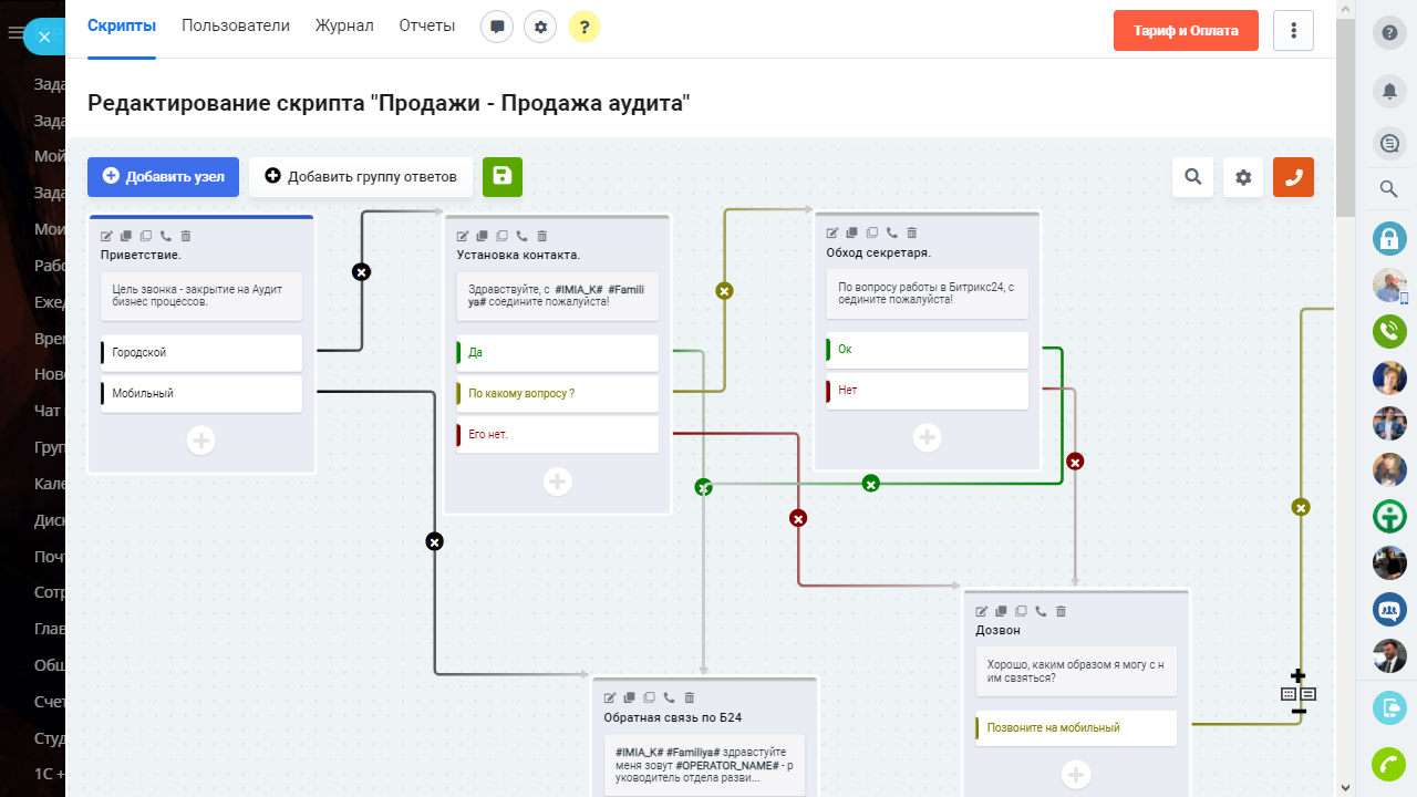 Редактор скриптов с функцией тестового звонка позволяет опробовать внесенные изменения уже на этом этапе, а разграничение прав доступа не дает возможности сотрудникам редактировать скрипт без Вашего ведома.
