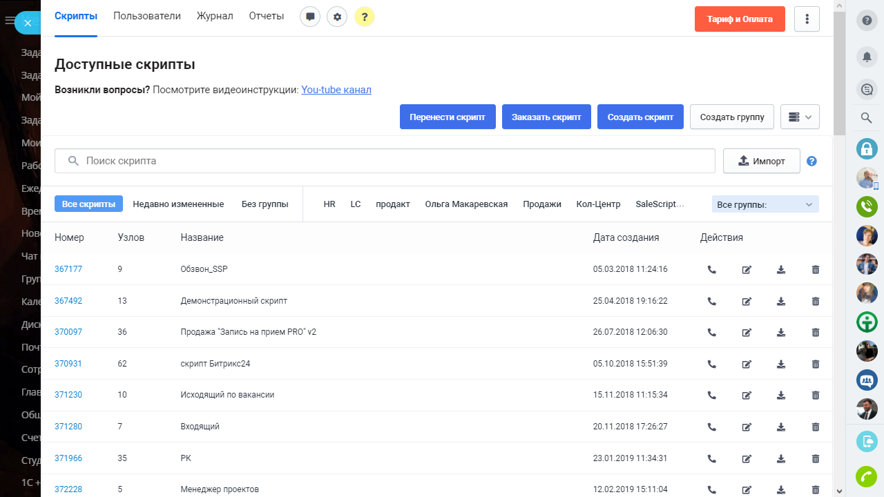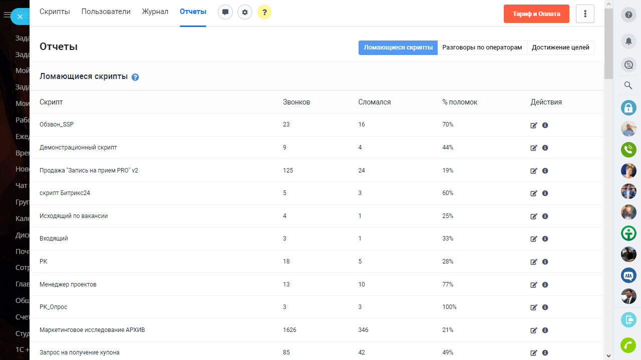 - отчеты для анализа результативности скриптов и самих сотрудников