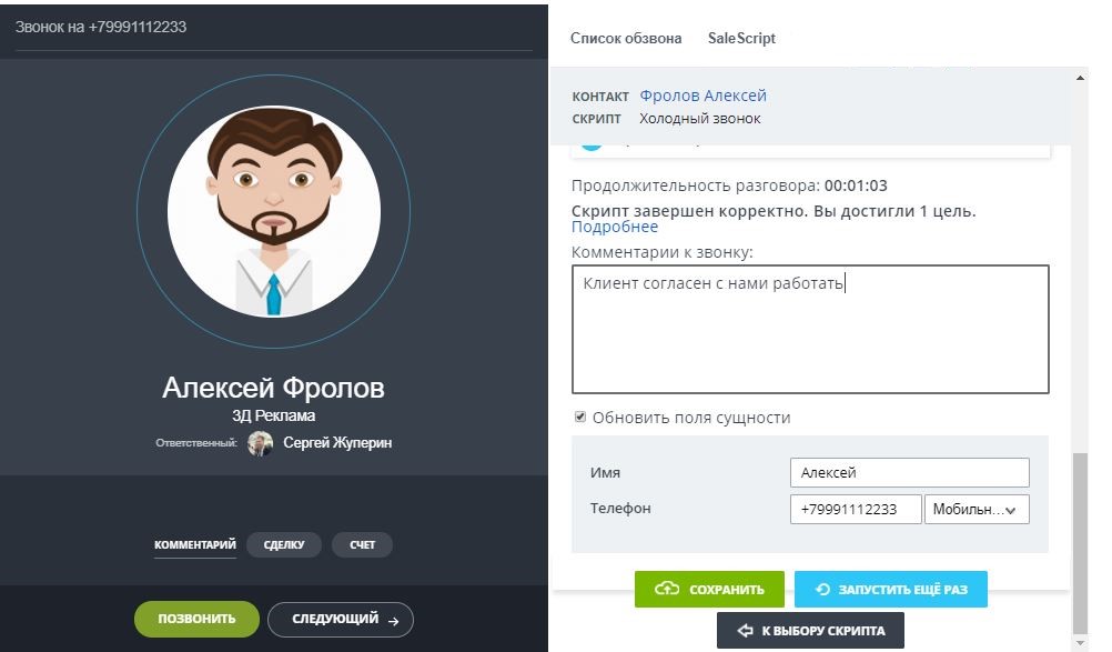 Если в процессе диалога с клиентом и использования скрипта выяснится, что данные о клиенте изменились, сотрудник имеет возможность сразу внести новую информацию. По окончании использования скрипта новые данные будут автоматически сохранены в CRM.