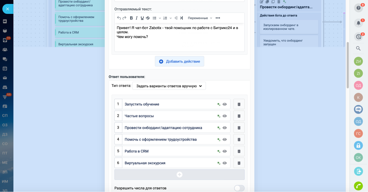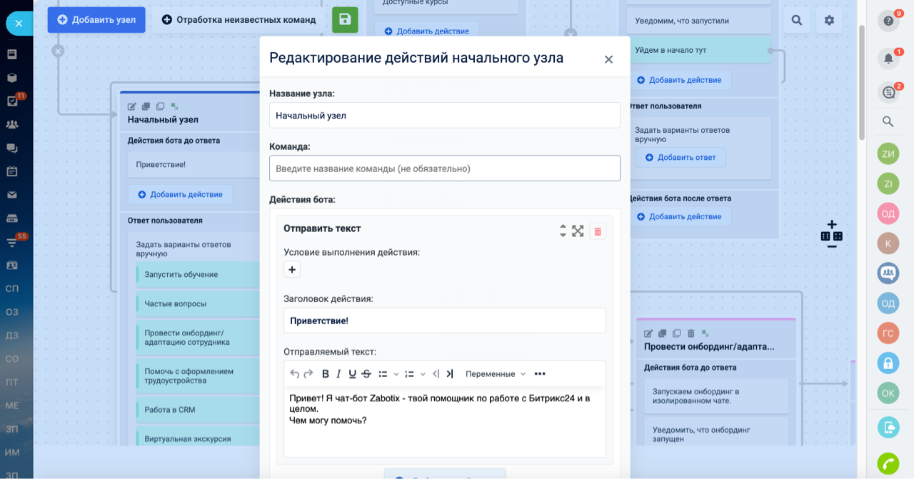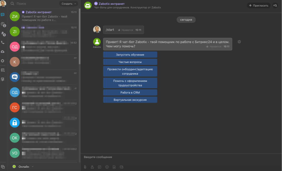 Конструктор чат-ботов для внутренних чатов Битрикс24. Информируйте сотрудников автоматически, принимайте внутренние заявки, проводите обучение, тестирование и адаптацию сотрудников с помощью чат-ботов во внутренних чатах Битрикс24 и нашего конструктора интранет чат-ботов Zabotix