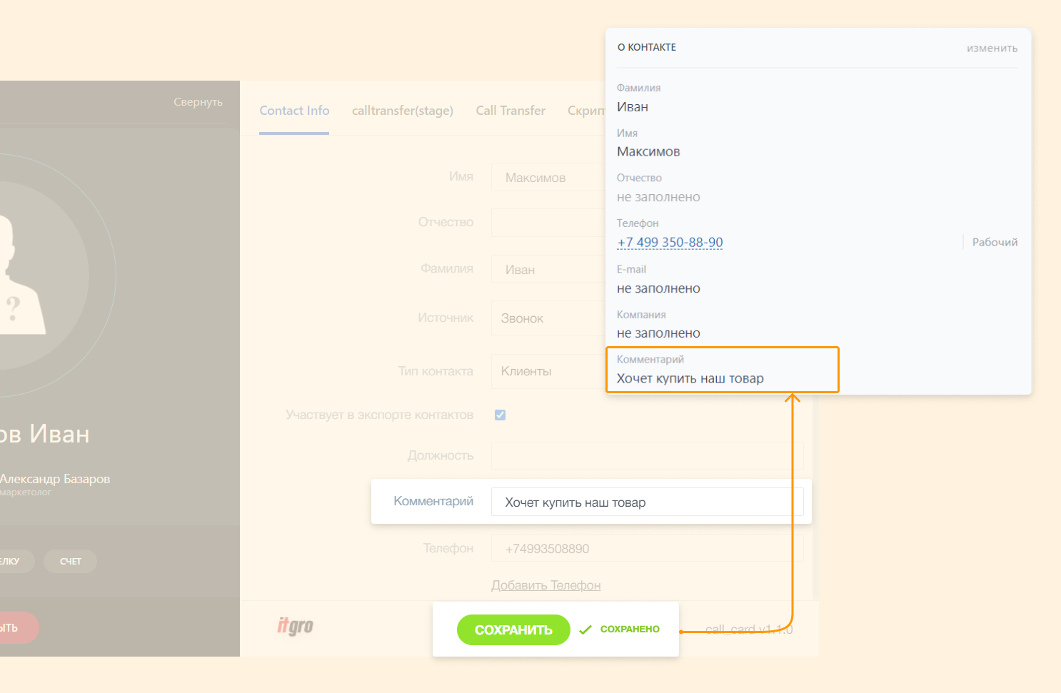Позволяет редактировать данные о клиенте прямо из карточки звонка