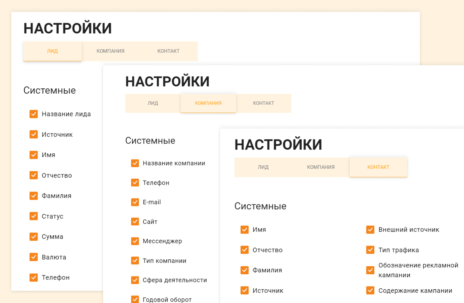 ✓ Для каждой сущности можно настроить свой набор полей. Настройка полей доступна после заполнения анкеты после установки