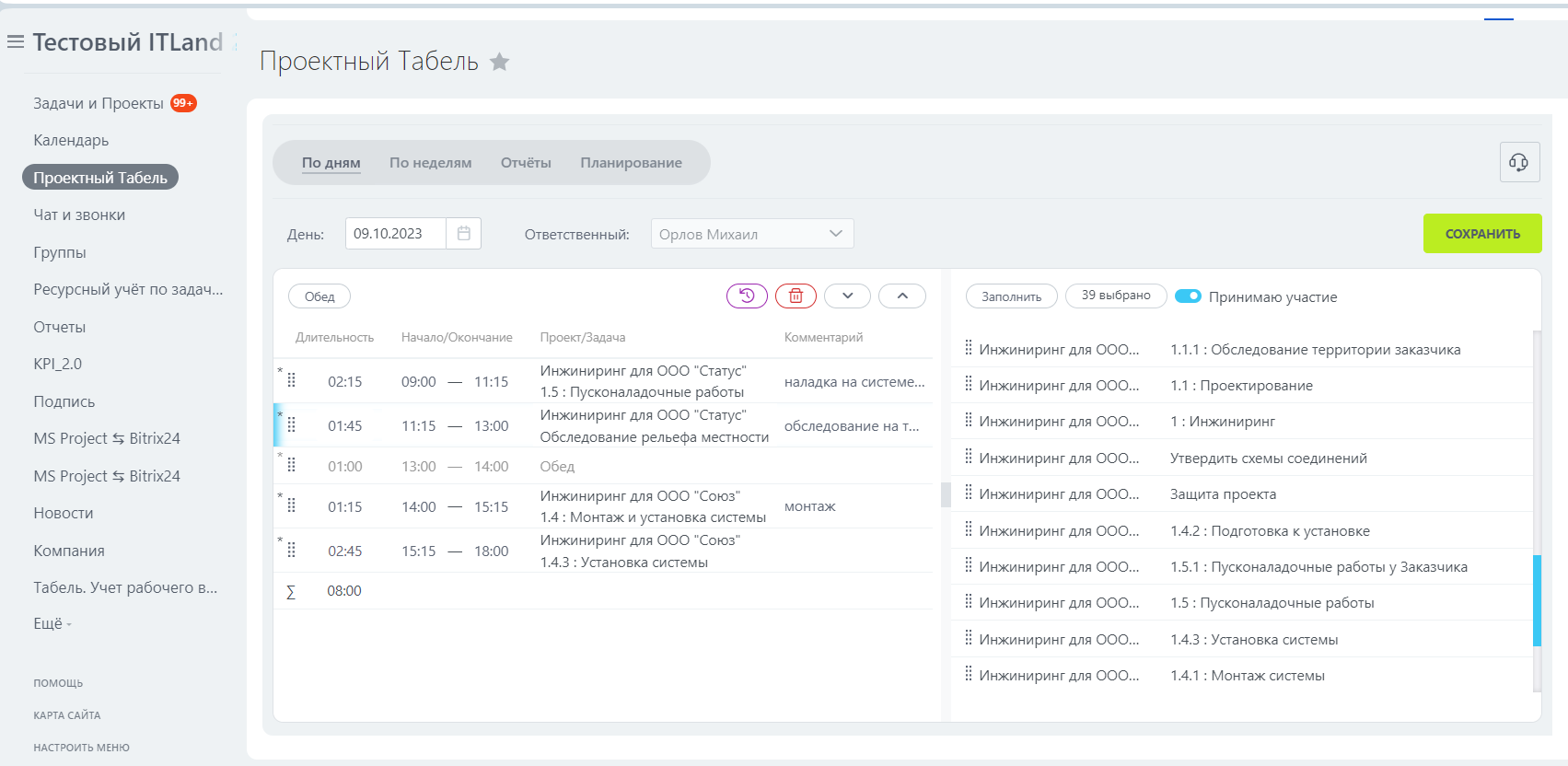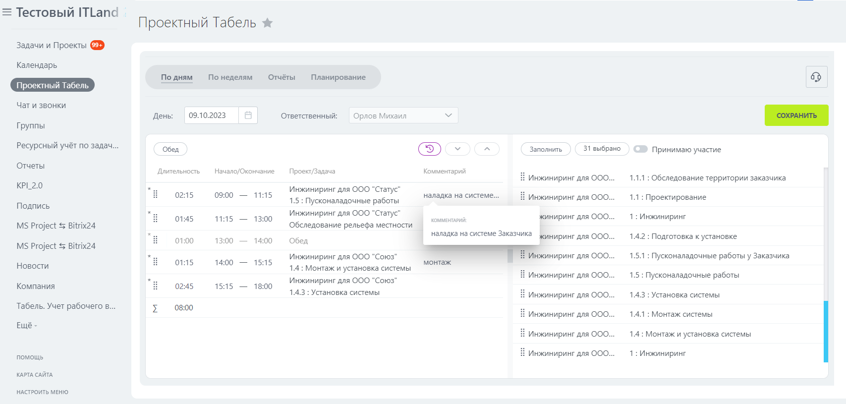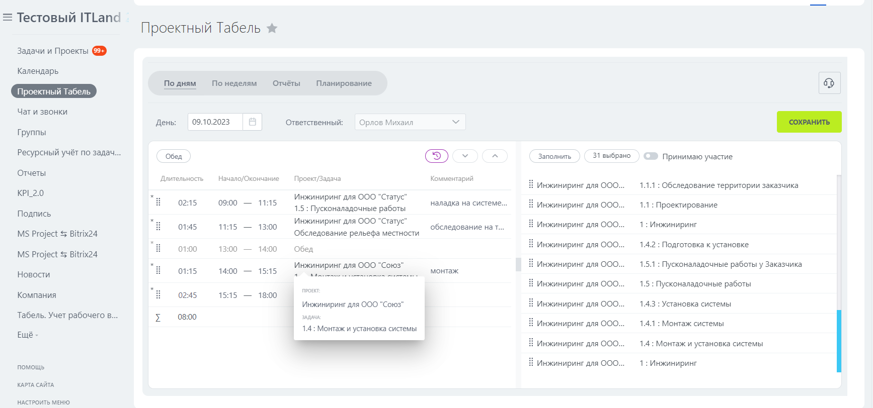 - Удобный Drag-and-drop задач в Табель в едином окне и лёгкое назначение времени;
